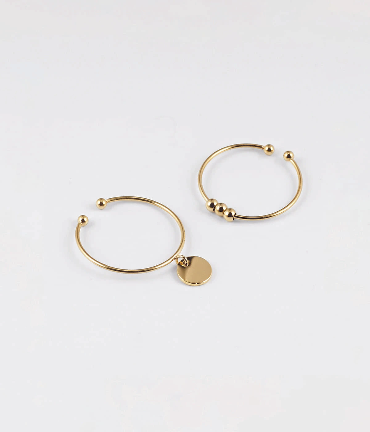 Double bague rĂ©glable en acier uni ou dorĂ© Ă l’or fin. Le premier anneau est agrĂ©mentĂ© d’une mĂ©daille montĂ©e en pampille et le second de petites boules.