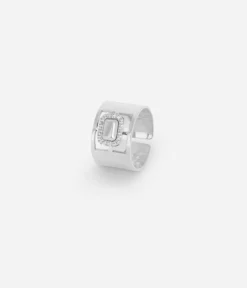 Bague large ajustable en acier uni ou dorĂ© Ă l’or fin avec en son centre une forme rectangulaire sertie de zirconiums.