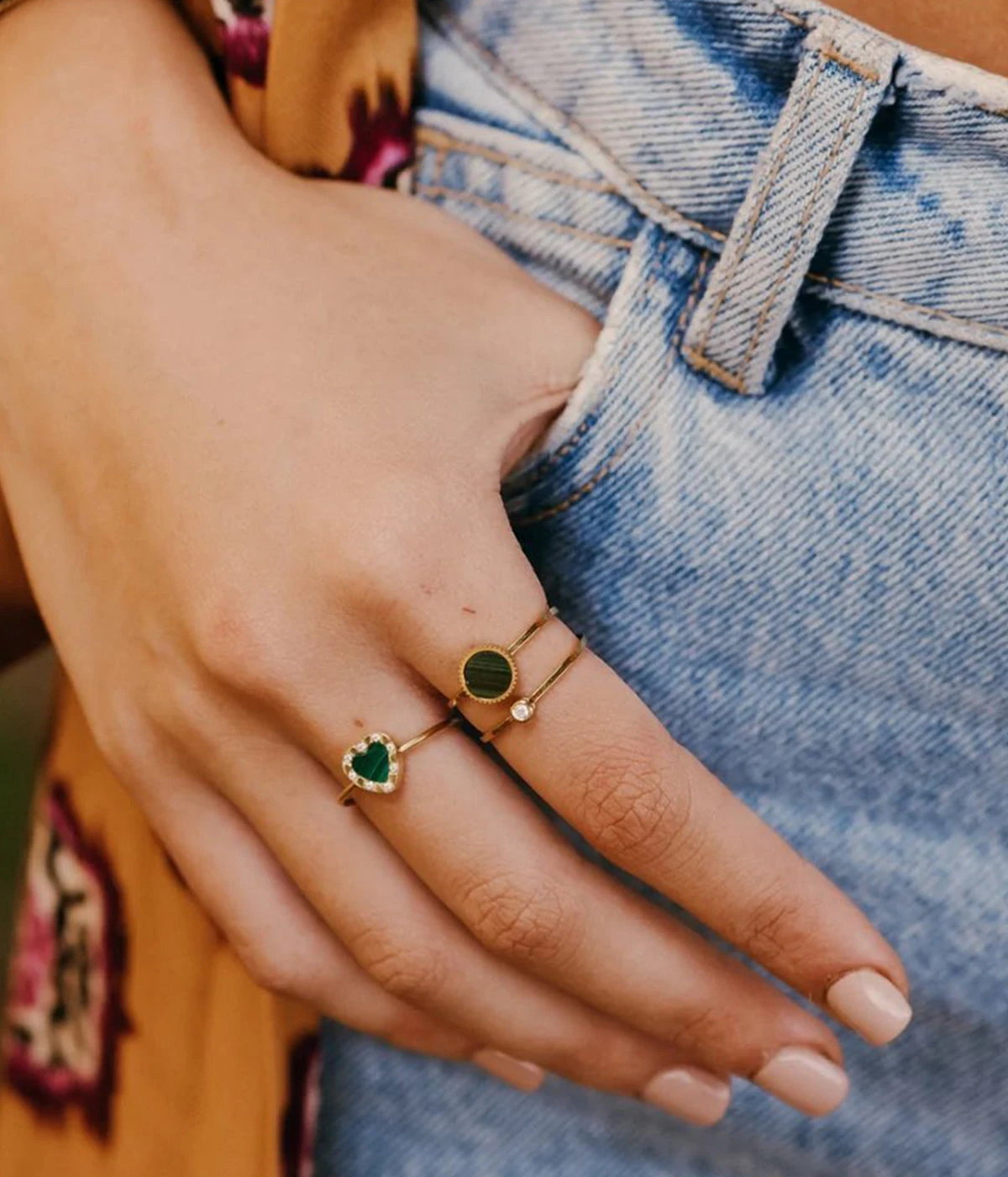 Bague double en acier dorĂ© Ă l’or fin sur laquelle est ornĂ©e un petit rond de couleur.Â