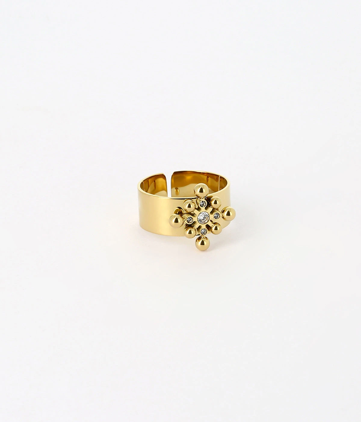 Bague en acier uni ou dorĂ© Ă l’or fin sur laquelle se trouve une forme carrĂ©e composĂ©e par de petites boules ornĂ©e au centre d’un zirconium.