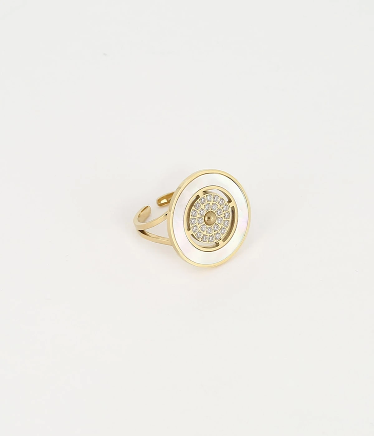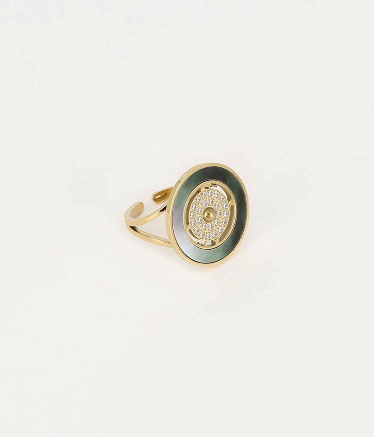 Bague en acier dorĂ© Ă lâor fin sur laquelle est attachĂ© un mĂ©daillon colorĂ©, formĂ© dâun cercle serti de zirconiums et piquĂ© dâune boule dâacier en son centre.