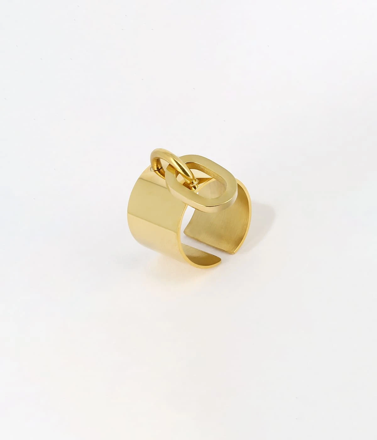Bague ajustable en acier uni ou dorĂ© Ă lâor fin sur laquelle est accrochĂ© en son centre un anneau mobile.