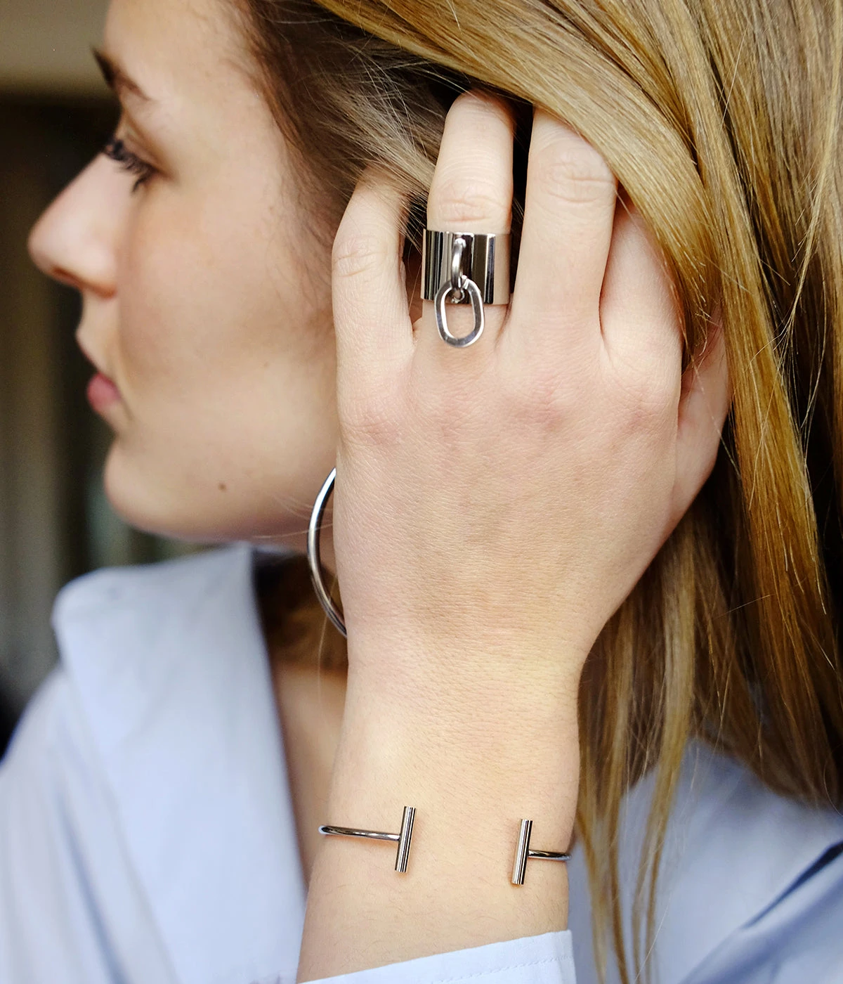 Bague ajustable en acier uni ou dorĂ© Ă lâor fin sur laquelle est accrochĂ© en son centre un anneau mobile.