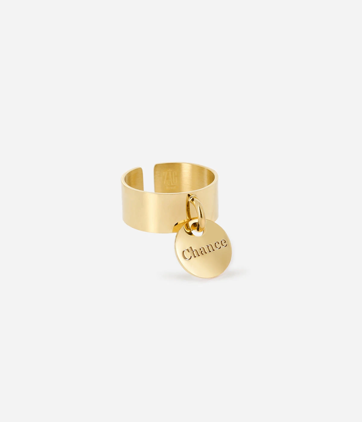Cette bague est formĂ©e dâun mĂ©daillon ajourĂ© du mot « Chance ».