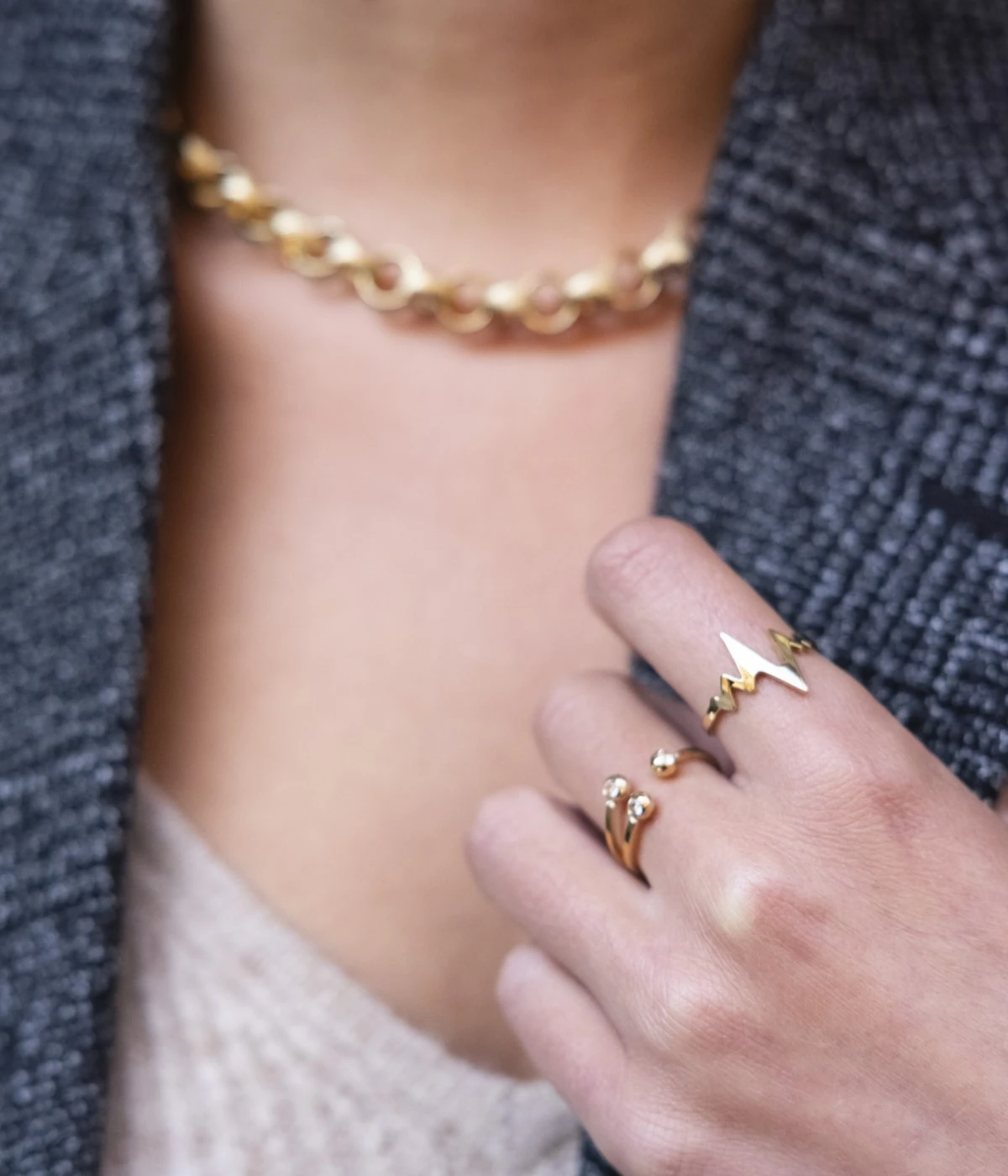 Bague ajustable en acier uni ou dorĂ© Ă l’or fin prĂ©sentant un battement de cĆur.