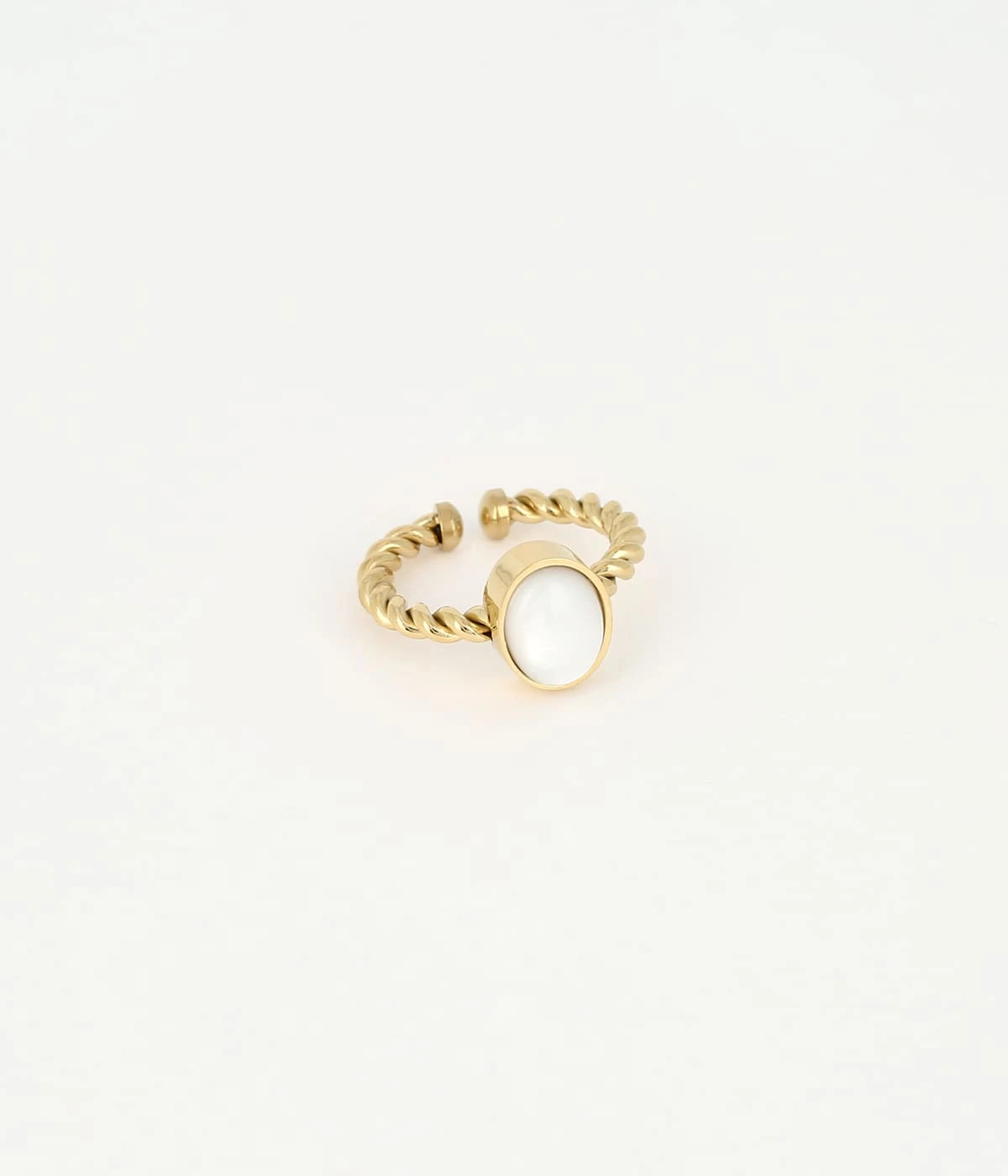 Bague large ajustable en acier dorĂ© Ă lâor fin avec en son centre une pierre naturelle.