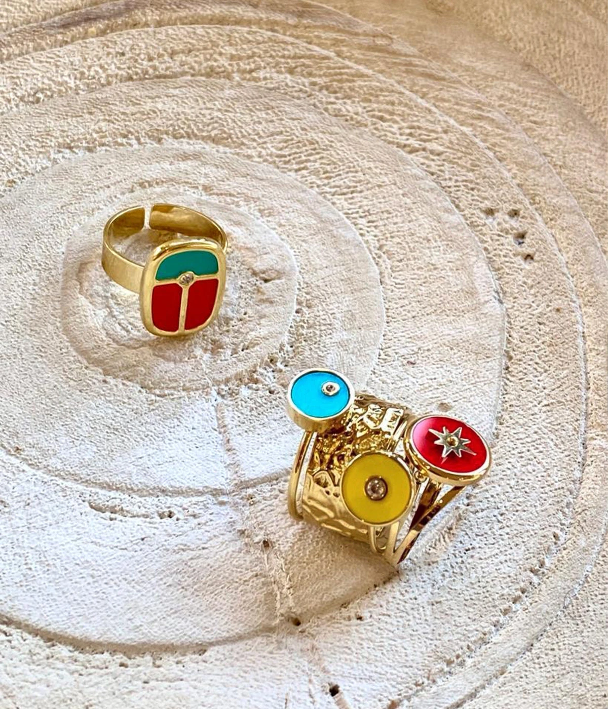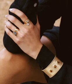 Bague en acier dorĂ© Ă l’or fin sur laquelle est fixĂ©e une plaque en nacre sertie d’un zirconium.