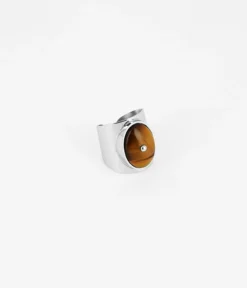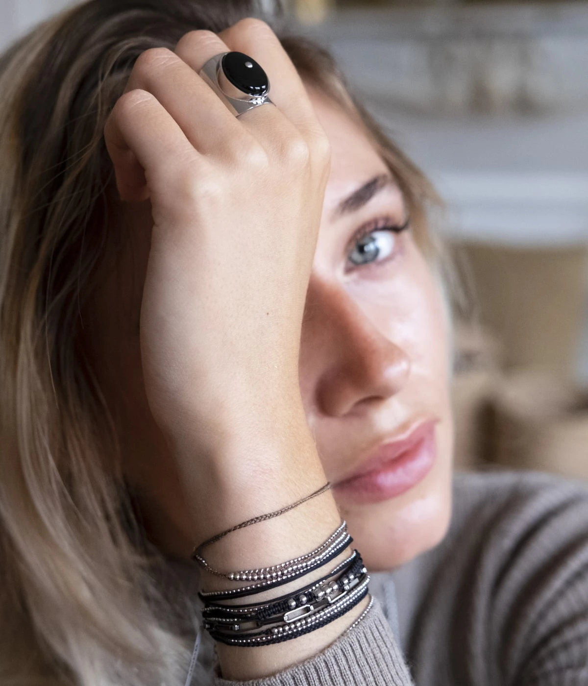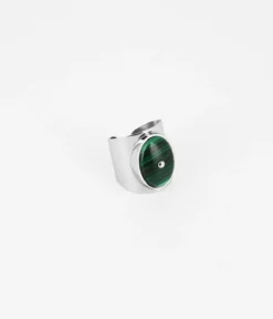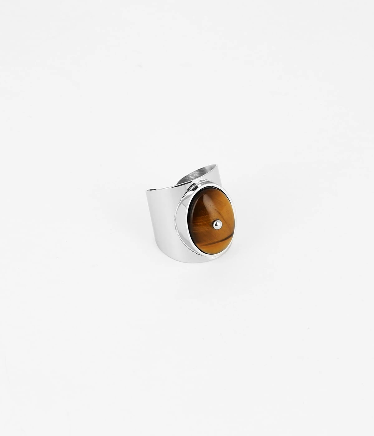 Bague large ajustable en acier uni composĂ©e d’une pierre naturelle piquĂ©e d’une boule d’acier au centre.