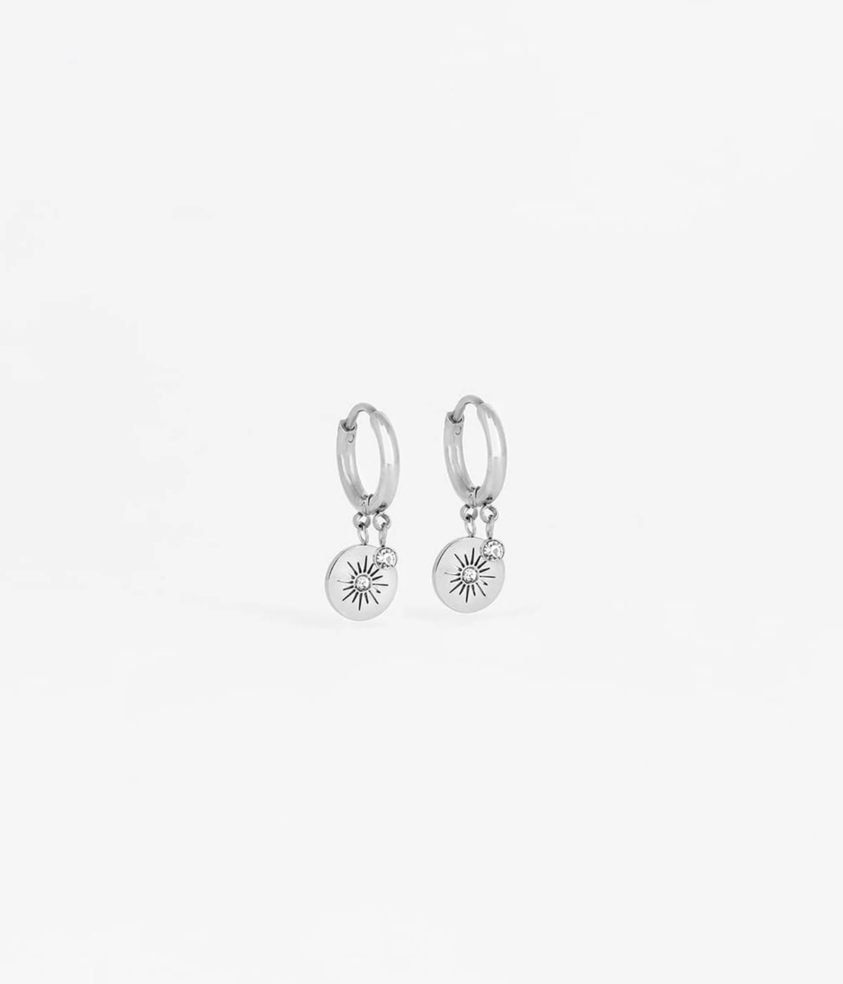 Boucles dâoreilles en acier uni ou dorĂ© Ă lâor fin sur lesquelles des mĂ©dailles gravĂ©es dâun motif soleil et un petit zirconium sont attachĂ©s.