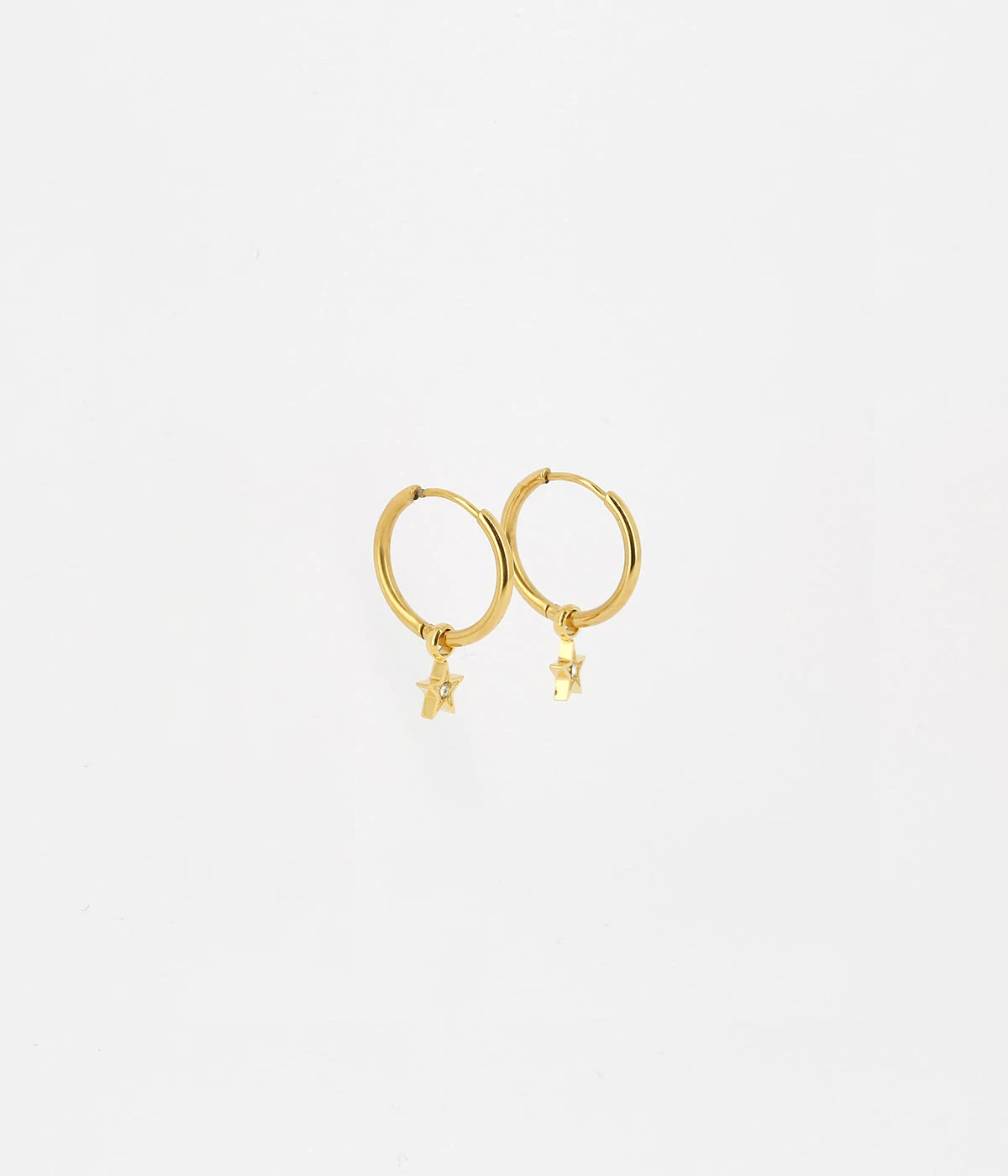 Boucles d’oreilles crĂ©oles en acier uni ou dorĂ© Ă l’or fin sur lesquelles un pendentif en forme d’Ă©toile et serti d’un zirconium est attachĂ©.
