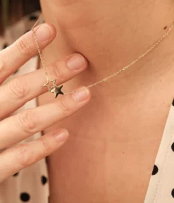 Boucles dâoreilles longues en acier dorĂ© Ă lâor fin. Des motifs de lune et d’Ă©toile pavĂ©s de zirconiums sont attachĂ©s sur des chaĂźnettes que forment ces boucles dâoreilles.