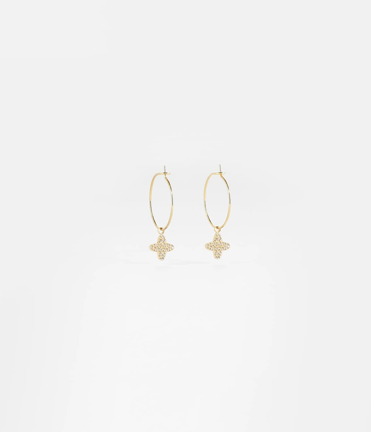 Boucles d’oreilles en acier uni ou dorĂ© Ă l’or fin. Chaque boucle est constituĂ©e d’un anneau fin auquel est suspendu un motif de fleur stylisĂ©e serti de zirconium.