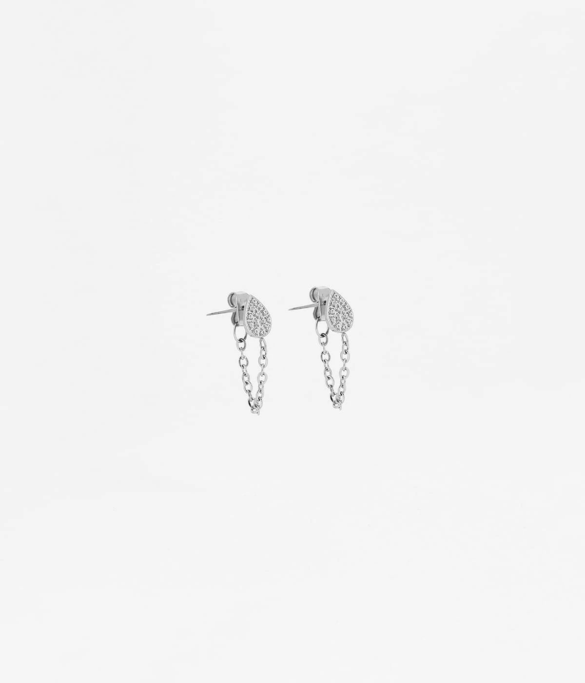 Boucles dâoreilles chaĂźnettes en acier uni ou dorĂ© Ă lâor fin formĂ©es de motifs gouttes sertis de zirconiums brillants.
