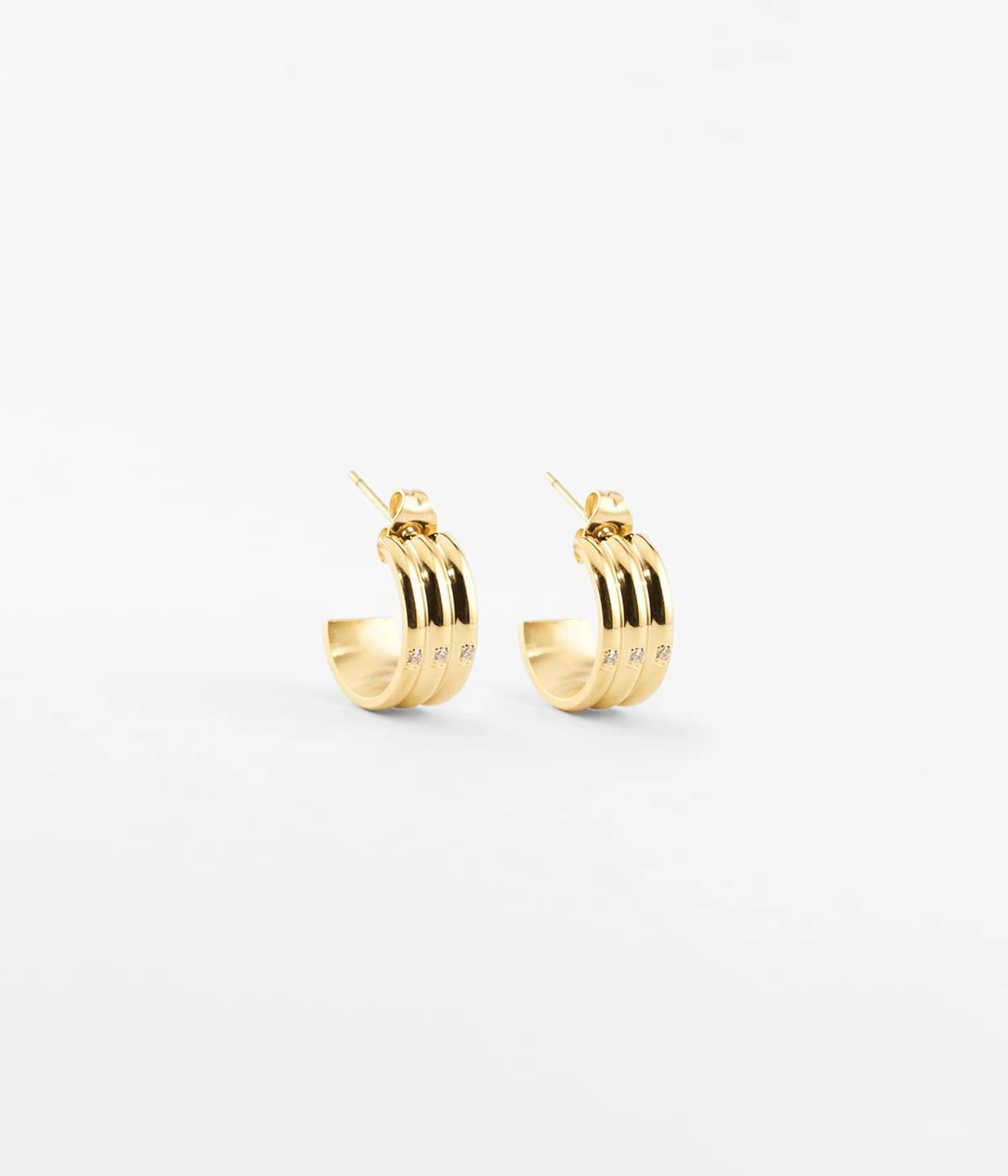 Boucles d’oreilles crĂ©oles en acier uni ou dorĂ© Ă l’or fin dont chaque boucle Ă l’apparence striĂ©e, est sertie de trois zirconiums.