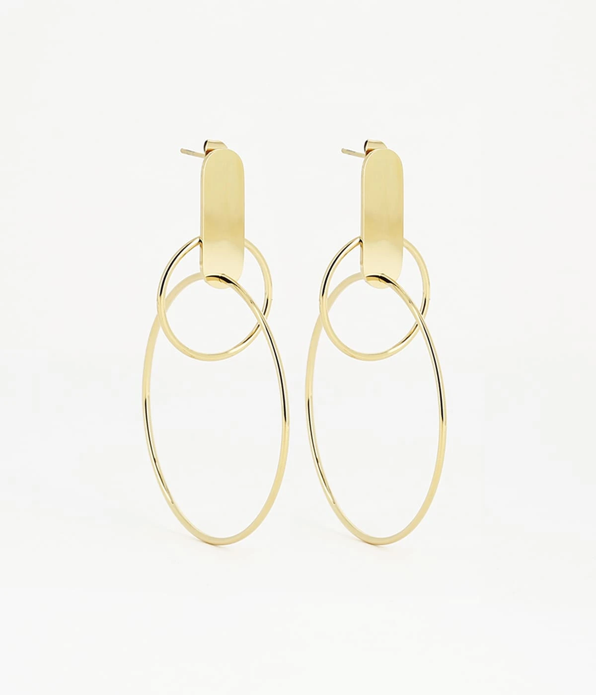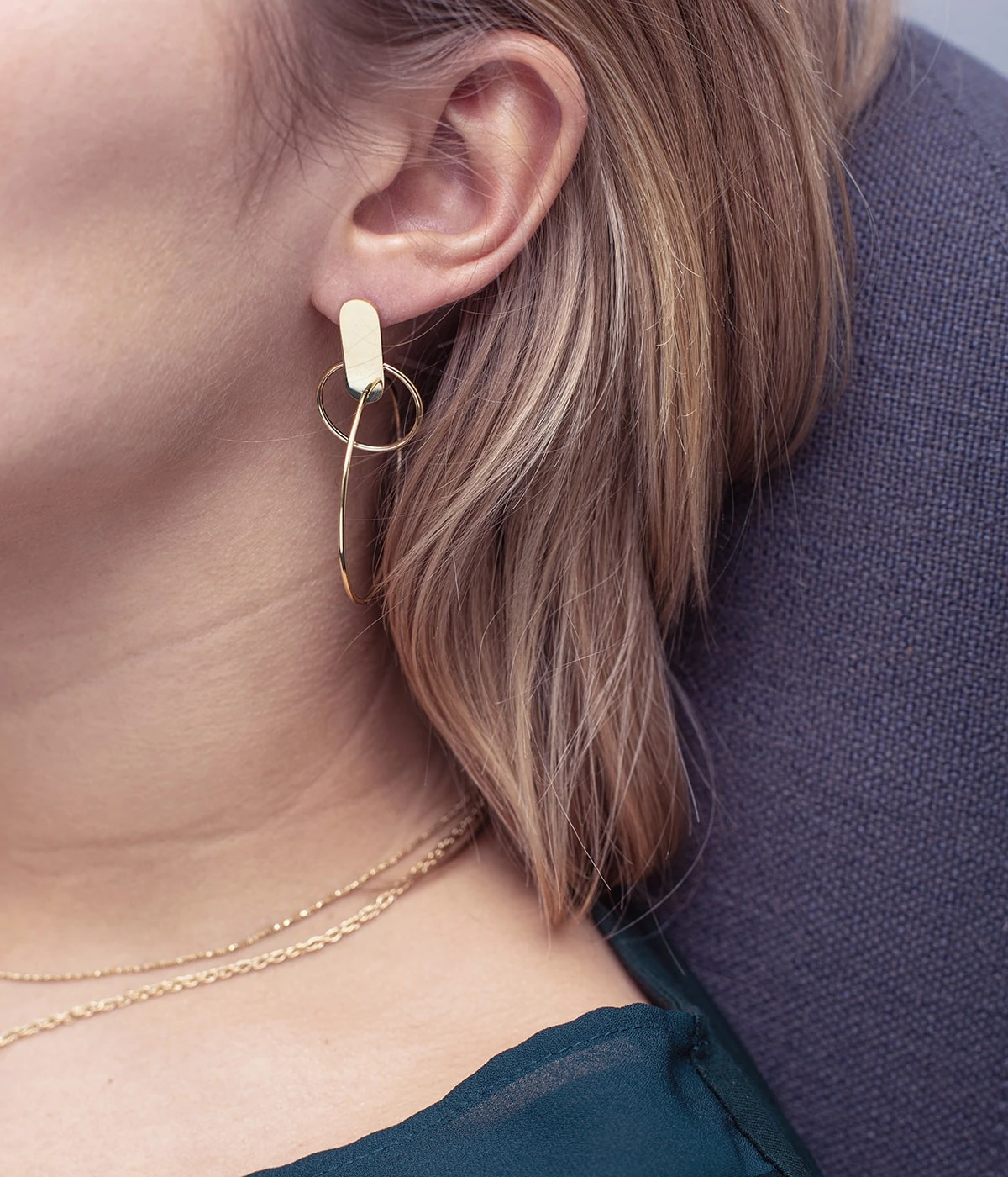 Boucles dâoreilles en acier uni et dorĂ© Ă lâor fin. Ces boucles dâoreilles sont grandes et rigides et sâinstallent au creux du cou comme une piĂšce dâarchitecture illuminant le visage.