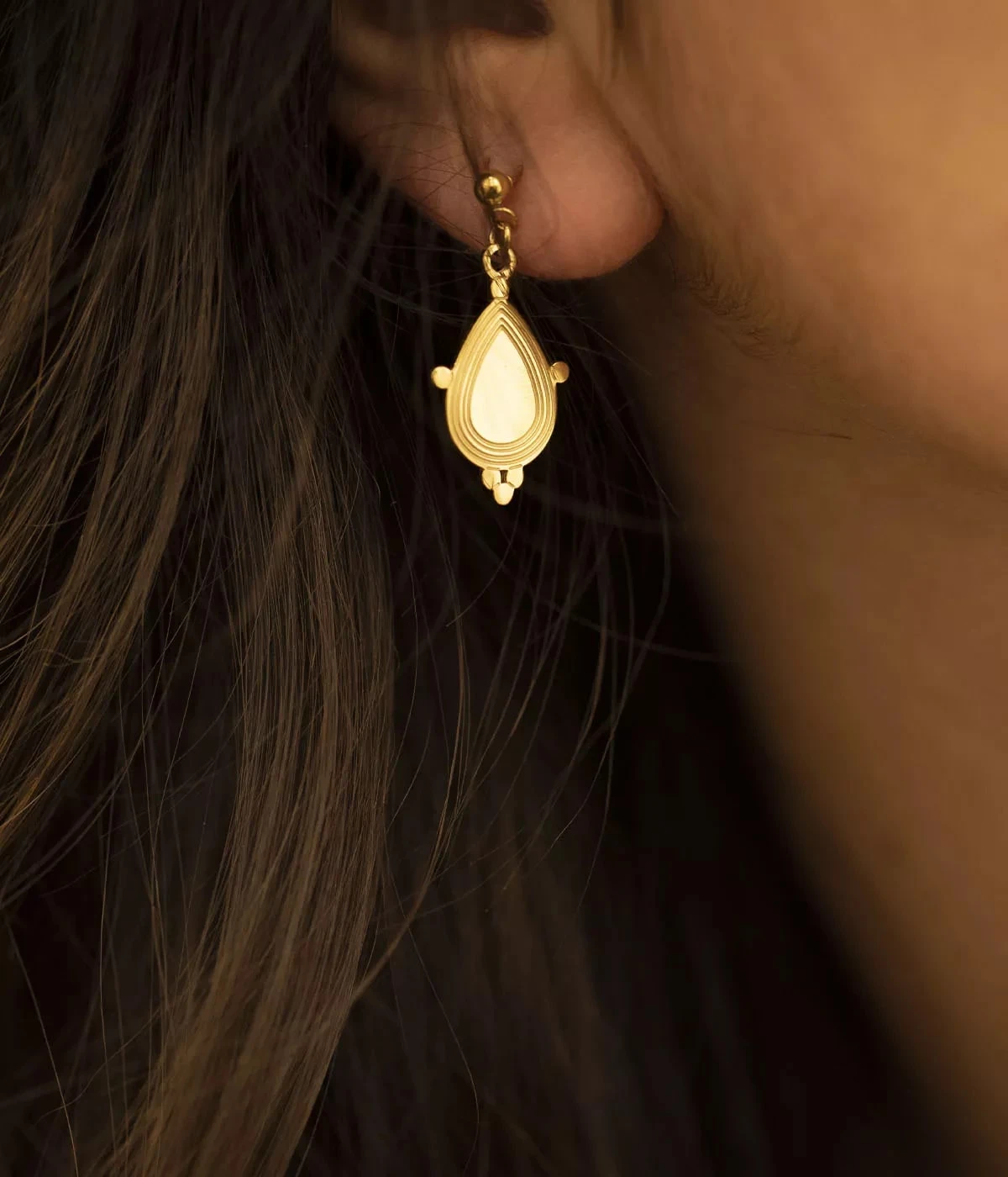 Boucles d’oreilles en acier uni ou dorĂ© Ă l’or fin. Les pampilles de mĂ©tal en forme de poire sont gravĂ©es et terminĂ©es de petites boules.