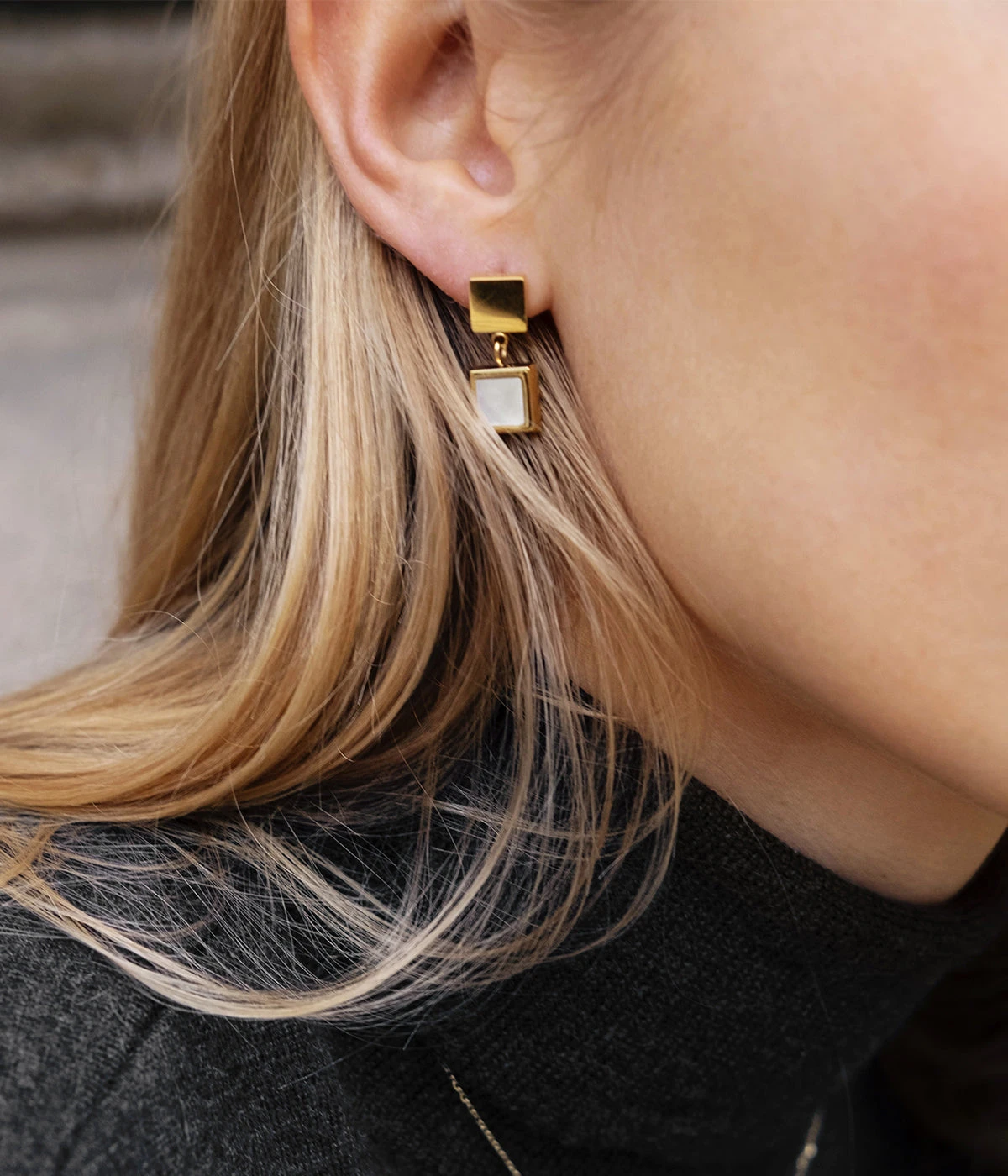 Boucles d’oreilles en acier dorĂ© Ă l’or fin avec deux formes carrĂ©es, la seconde en nacre.