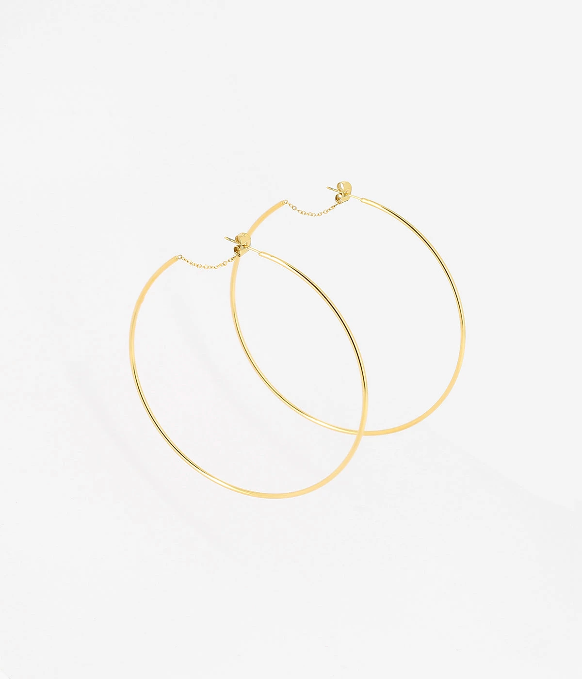 Boucles d’oreilles en acier uni ou dorĂ© Ă l’or fin. Une chaĂźnette relie le bout de la crĂ©ole au fermoir papillon.