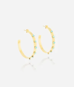 Boucles d’oreilles crĂ©oles en acier dorĂ© Ă l’or fin composĂ©es de zirconiums colorĂ©es et de pierres naturelles.
