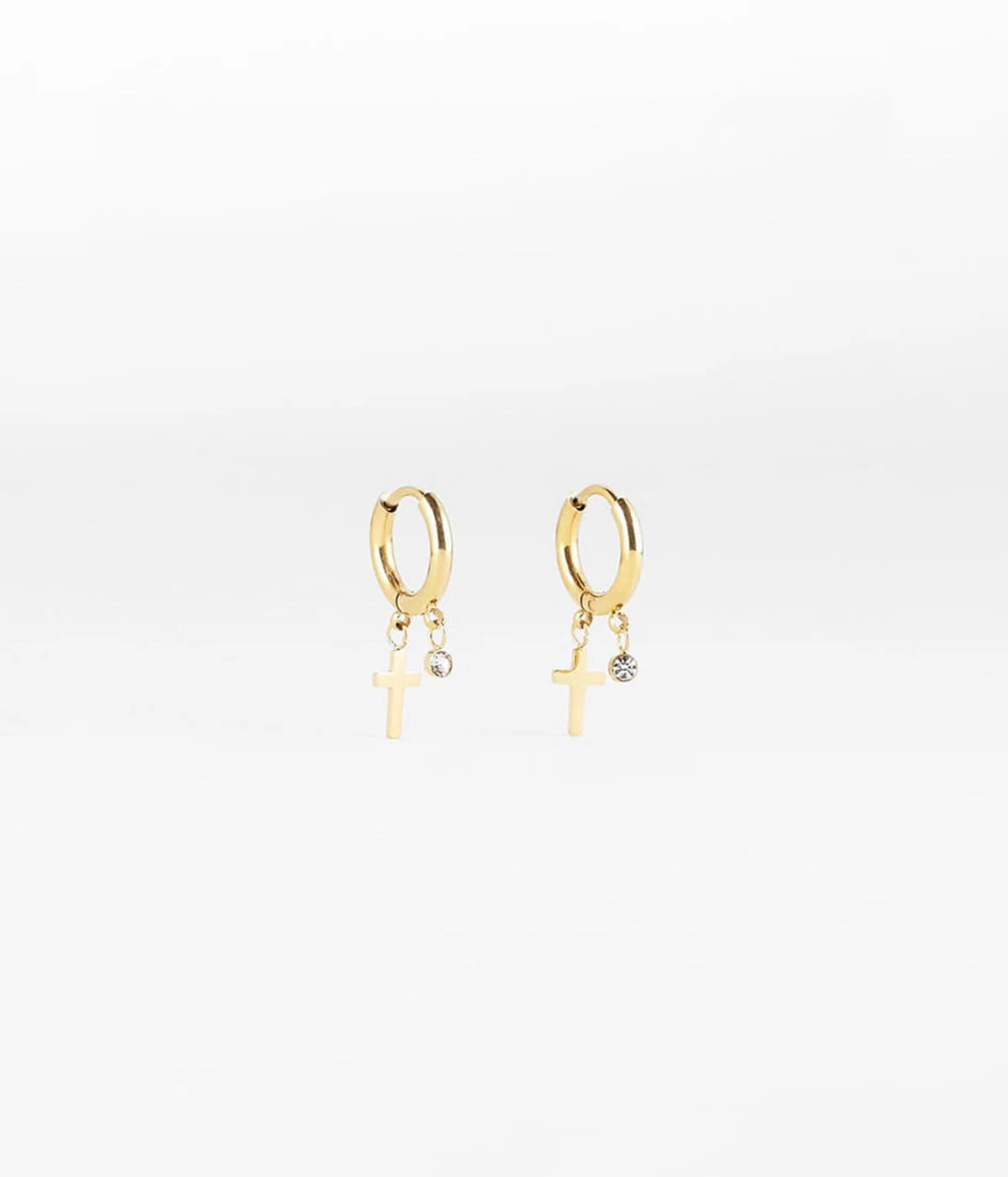Boucles d’oreilles mini-crĂ©oles en acier uni ou dorĂ© Ă l’or fin sur lesquelles sont accrochĂ©s une petite pampille en croix et un zirconium.