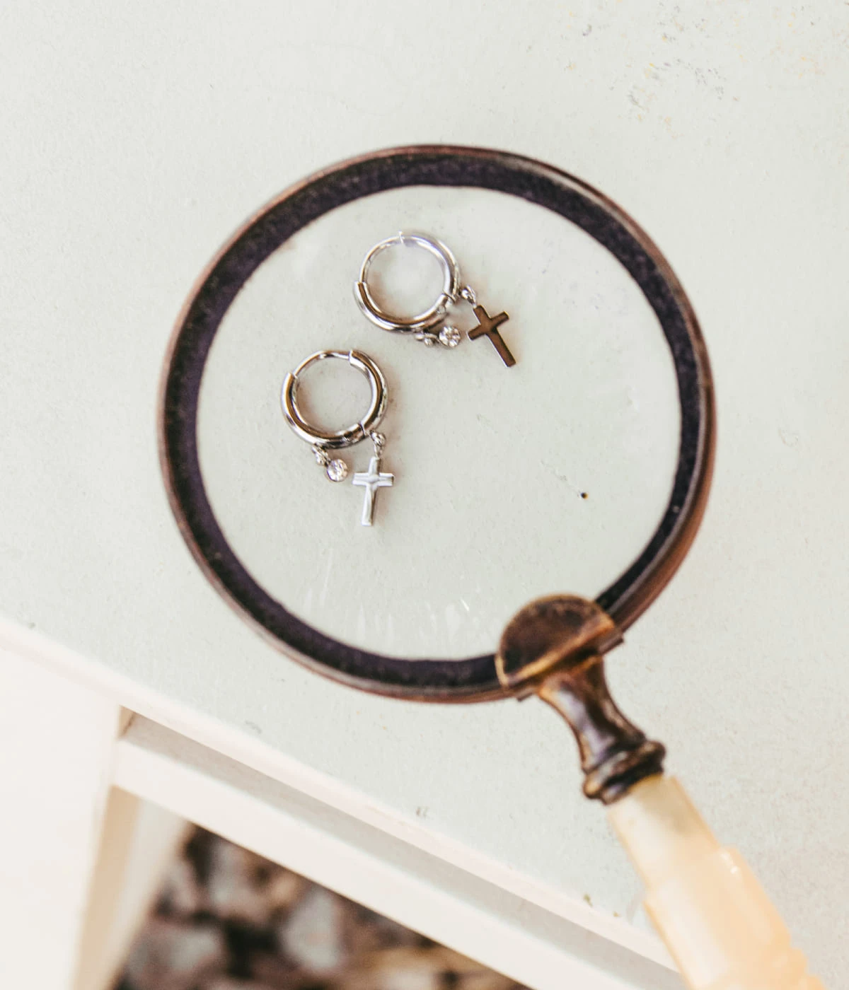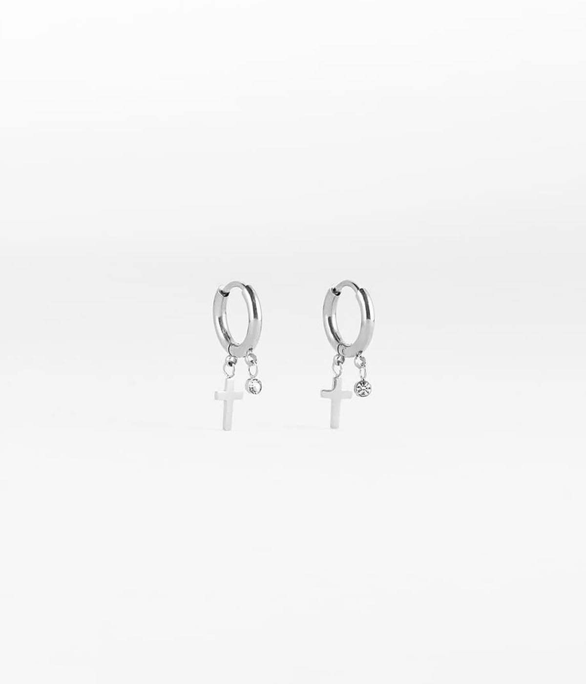 Boucles d’oreilles mini-crĂ©oles en acier uni ou dorĂ© Ă l’or fin sur lesquelles sont accrochĂ©s une petite pampille en croix et un cristal blanc.