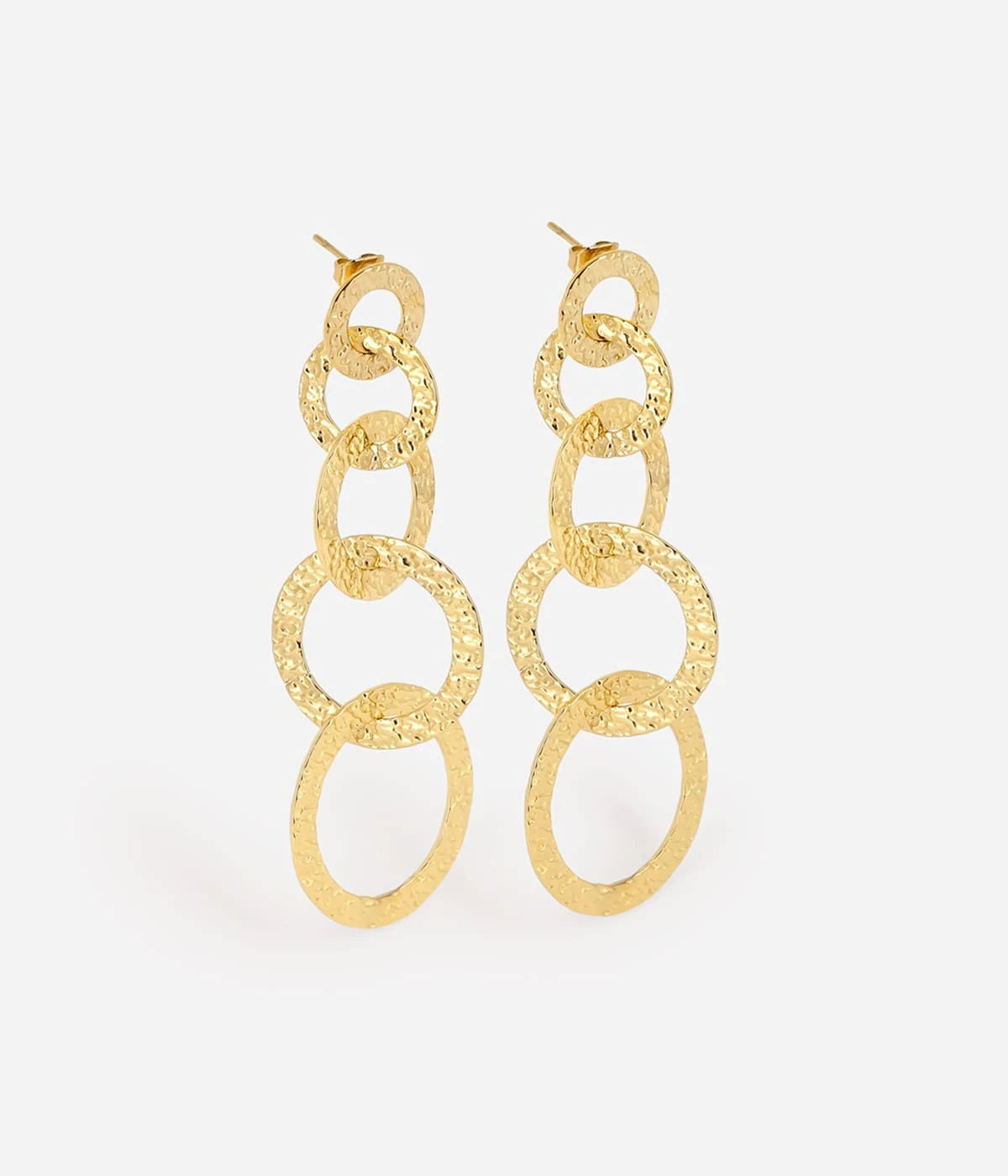 Boucles dâoreilles en acier dorĂ© Ă lâor fin composĂ©es de plusieurs anneaux attachĂ©s successivement.