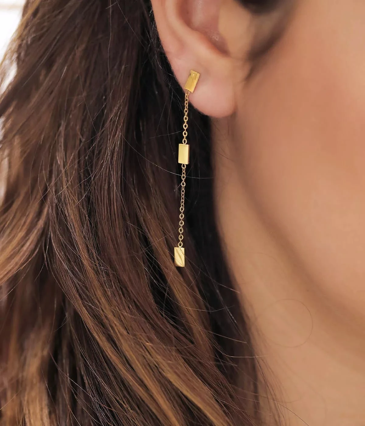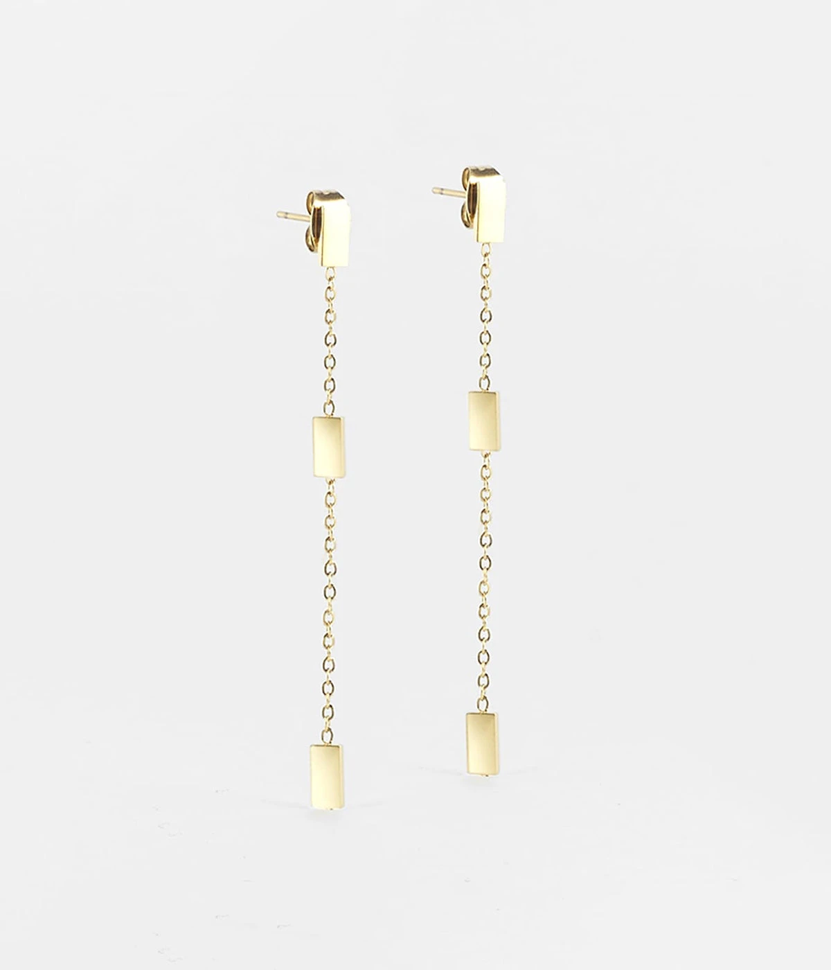 Boucles d’oreilles longues en acier uni ou dorĂ© Ă l’or fin formĂ©es d’une chaĂźnette simple sur laquelle sont accrochĂ©s des rectangles mĂ©talliques.