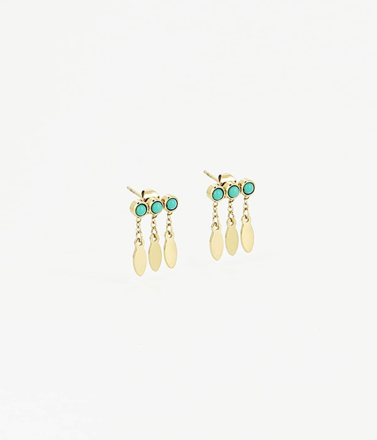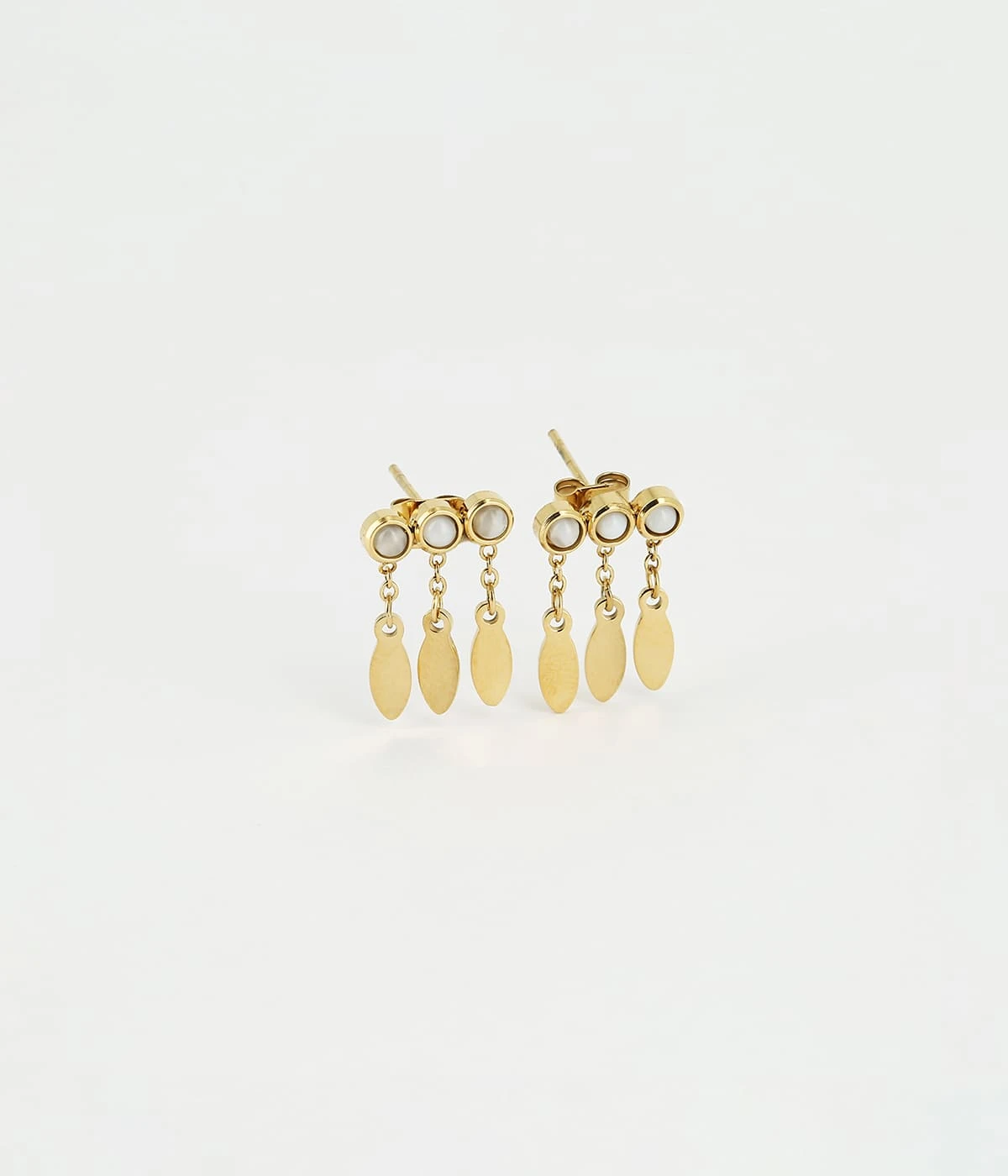 Boucles dâoreilles chaĂźnettes en acier uni ou dorĂ© Ă lâor fin sur lesquelles sont serties trois pierres fines ou trois zirconiums brillants. Dâautres petites chaĂźnes sont attachĂ©es sur les pierres et se terminent de petites feuilles de mĂ©tal finement dĂ©coupĂ©es au laser dans nos ateliers.