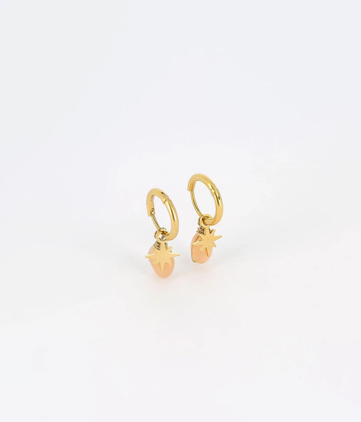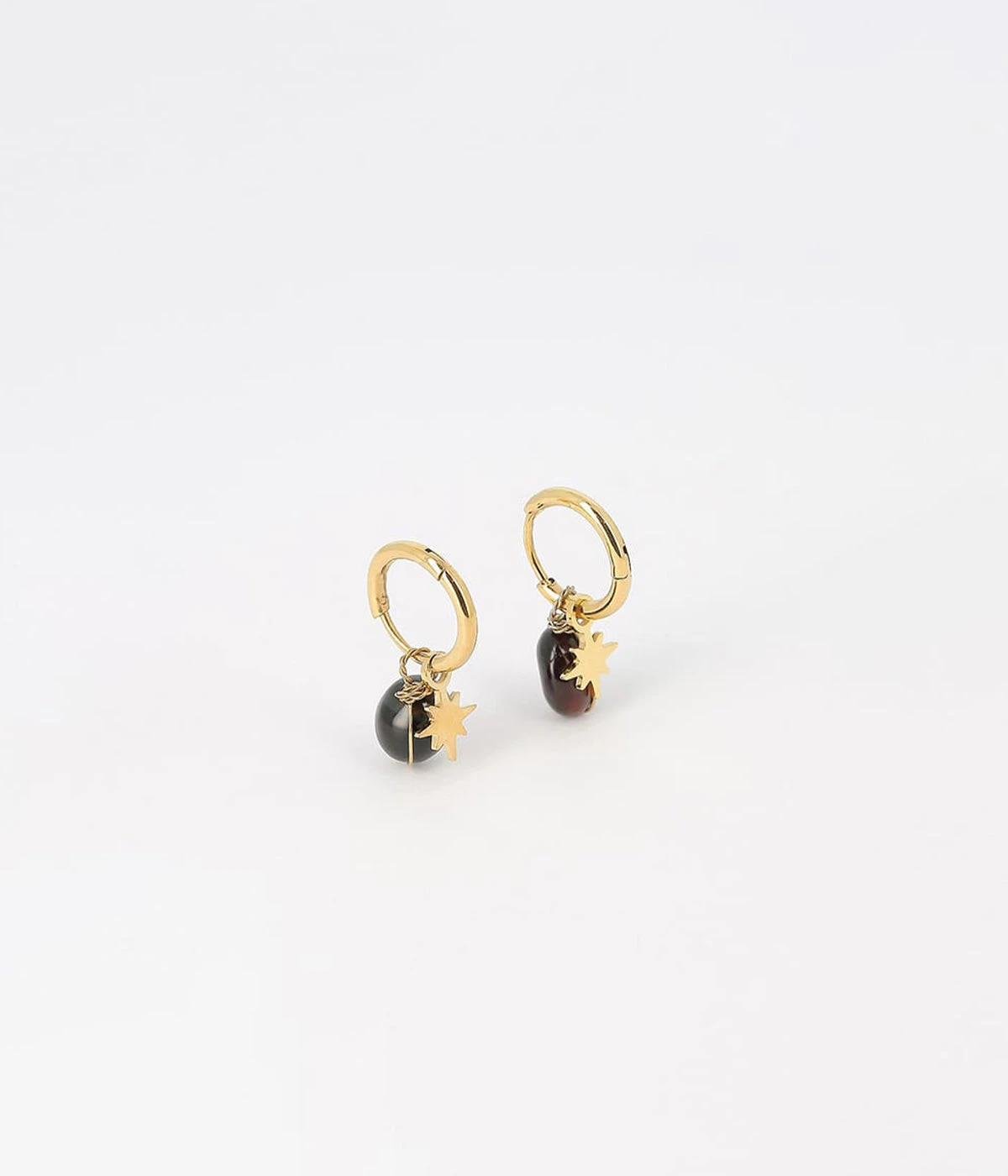 Boucles d’oreilles en acier doré à l’or fin sur lesquelles sont attachées en pampilles deux pierres fines taillées en forme de grain de café et deux petites roses des vents de métal.
