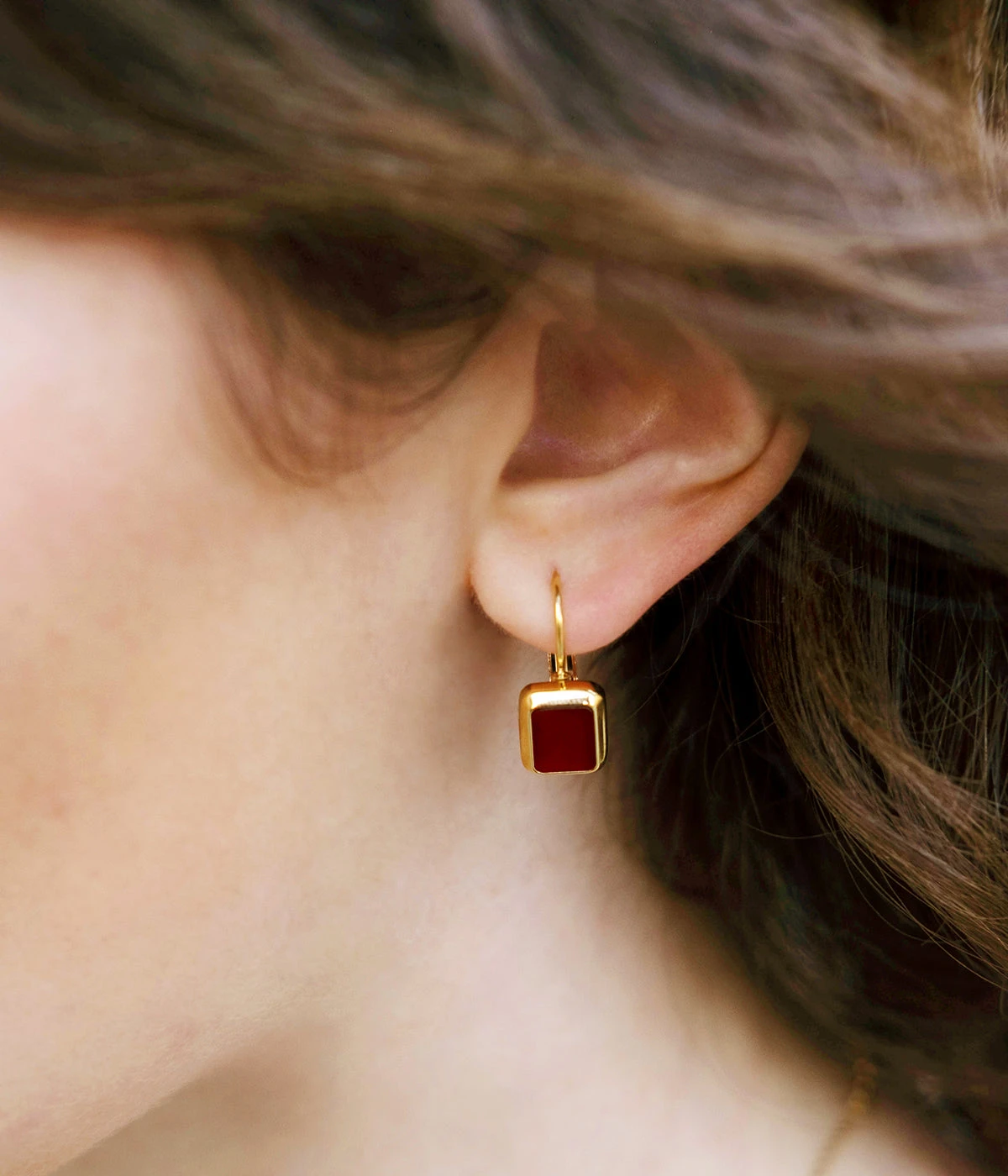 Boucles d’oreilles en acier dorĂ© Ă l’or fin prĂ©sentant un motif rectangulaire de pierre naturelle.