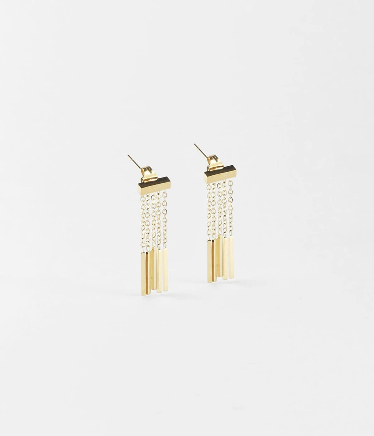 Petite pluie de chaĂźnettes terminĂ©es de pampilles de mĂ©tal pour ces boucles d’oreilles longues en acier uni ou dorĂ© Ă l’or fin.