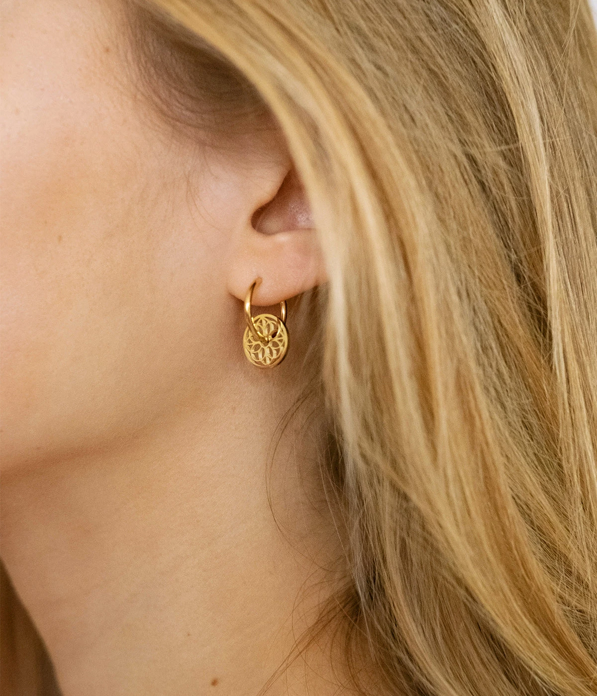 Boucles d’oreilles crĂ©oles en acier dorĂ© Ă l’or fin sur lesquelles est suspendue une piĂšce dĂ©tachĂ©e reprĂ©sentant une rosace.