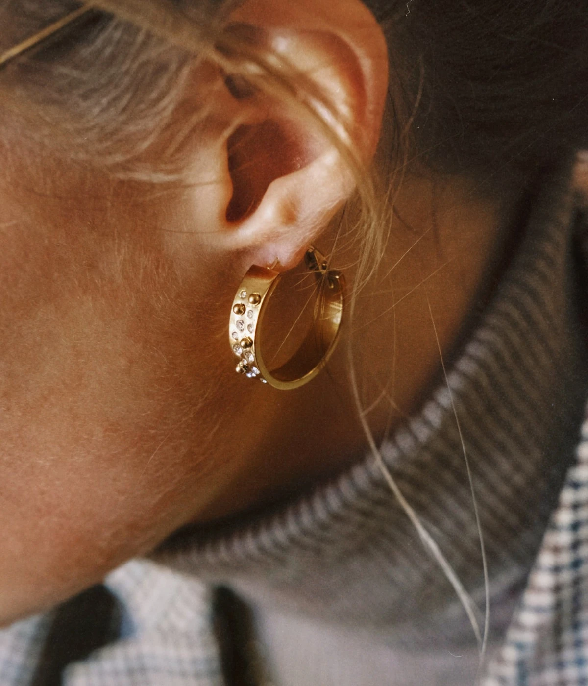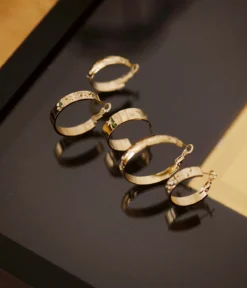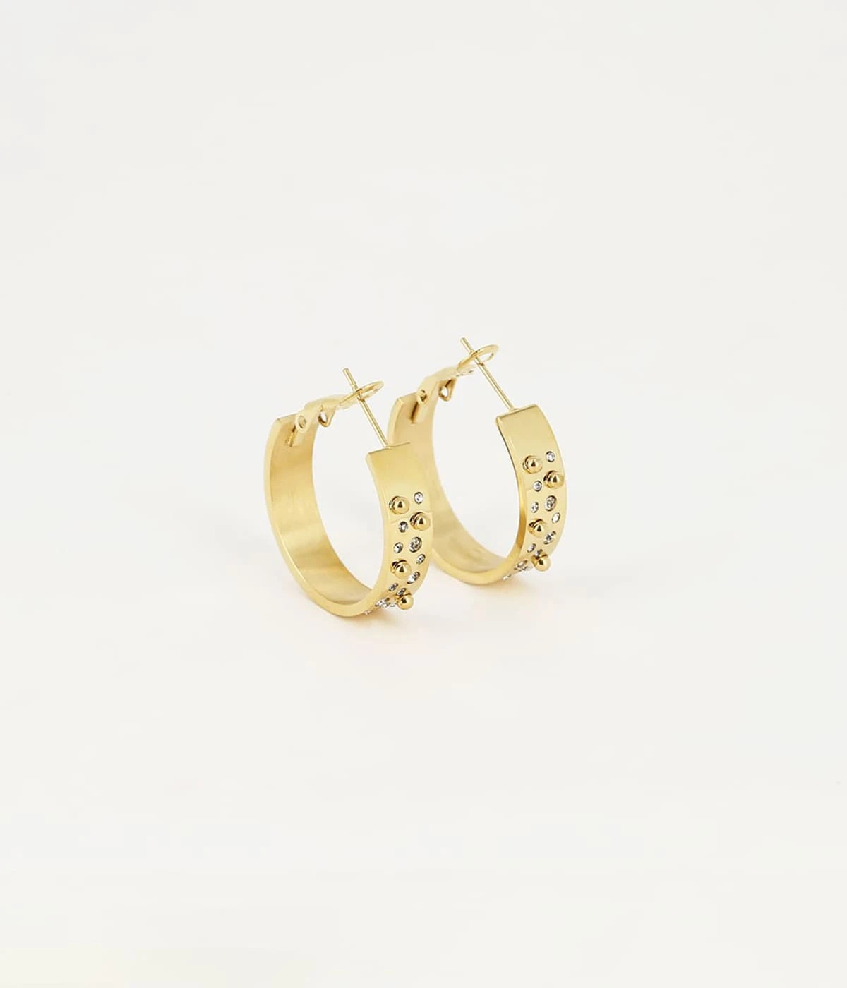 Boucles dâoreilles en acier uni ou dorĂ© Ă lâor fin sur lesquelles sont parsemĂ©s des zirconiums et des boules d’acier.