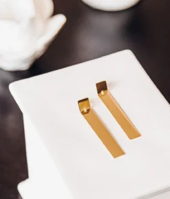 Boucles d’oreilles longues en acier uni ou dorĂ© Ă l’or fin de forme gĂ©omĂ©trique.
