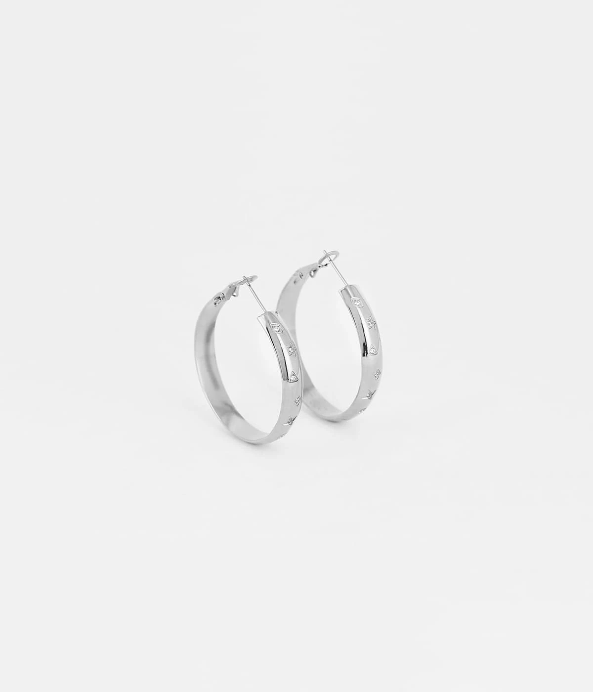 Boucles dâoreilles crĂ©oles en acier uni ou dorĂ© Ă lâor fin sur lesquelles sont tapĂ©es des formes gĂ©omĂ©triques sertis de zirconiums en leurs centre.