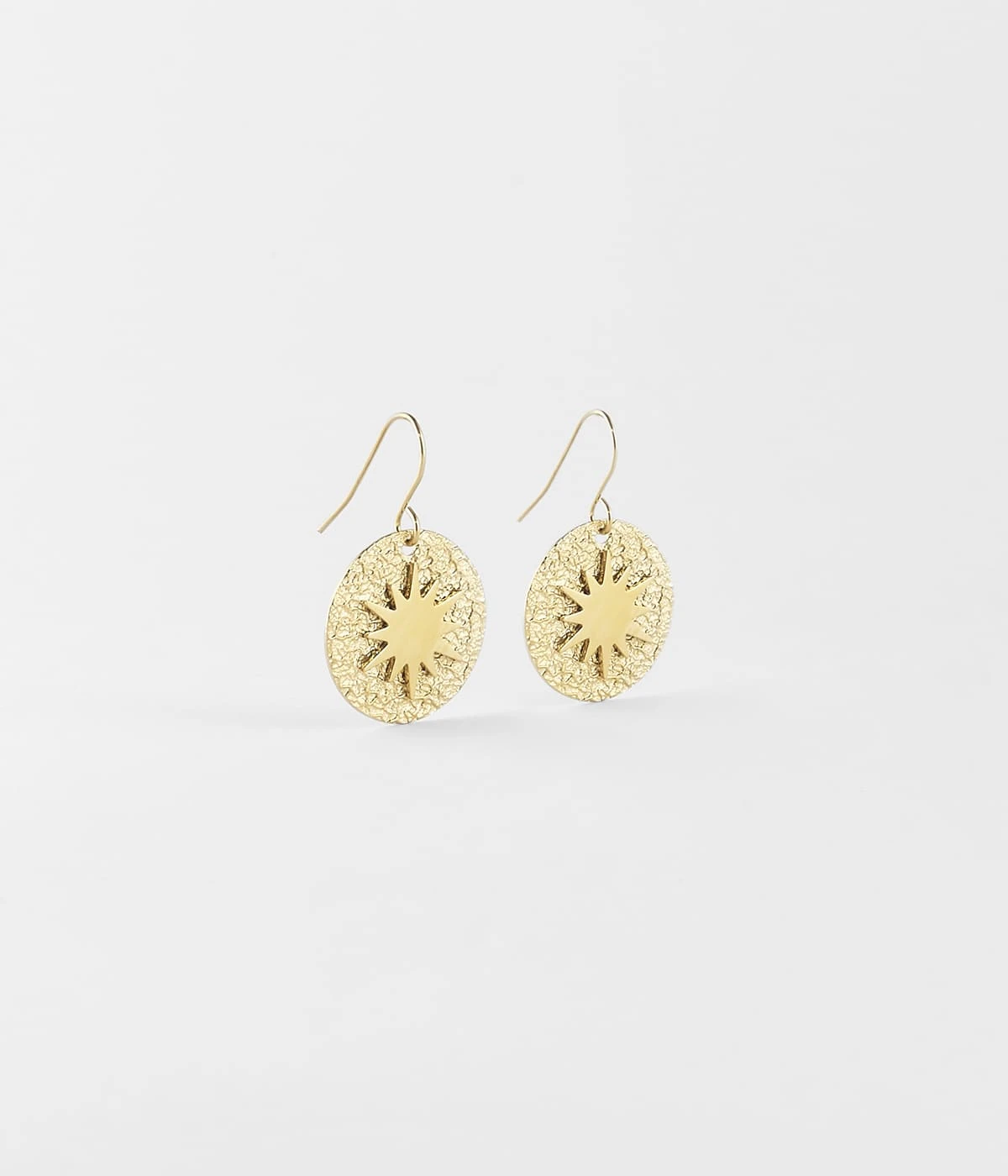 Les mĂ©dailles de ces dormeuses sont martelĂ©es Ă la main dans nos ateliers et piquĂ©es d’un motif de soleil.