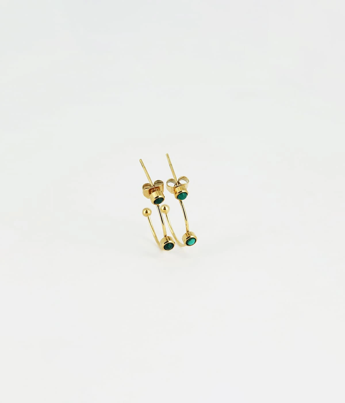 Boucles dâoreilles crĂ©oles en acier dorĂ© Ă lâor fin sur lesquelles des zirconiums brillants ou des pierres fines sont serties.