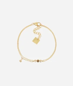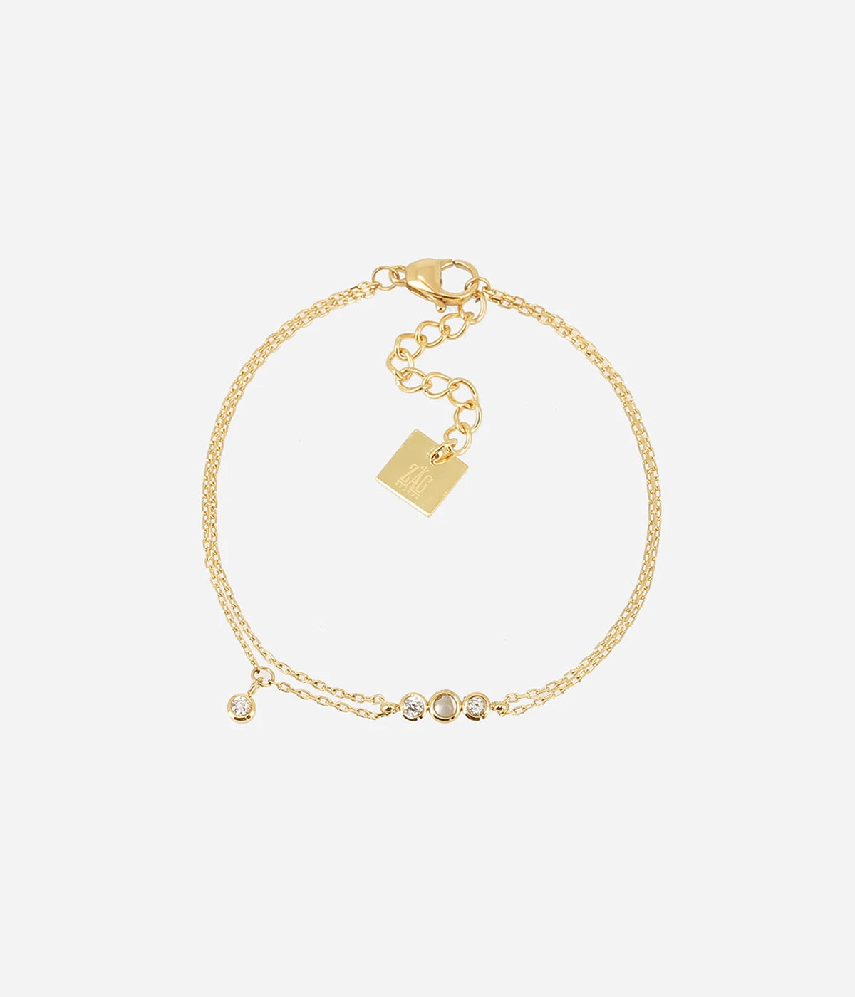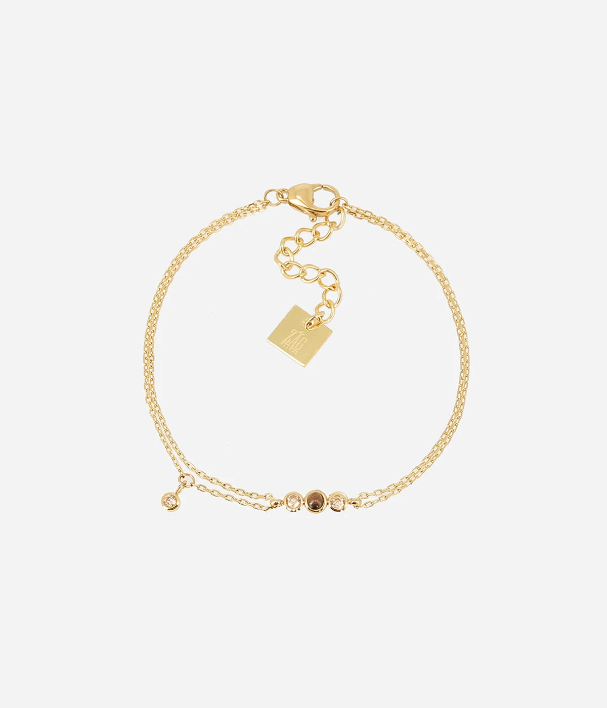 Bracelet Ă double range en acier dorĂ© Ă l’or fin prĂ©sentant des zirconiums colorĂ©s et une pierre naturelle.