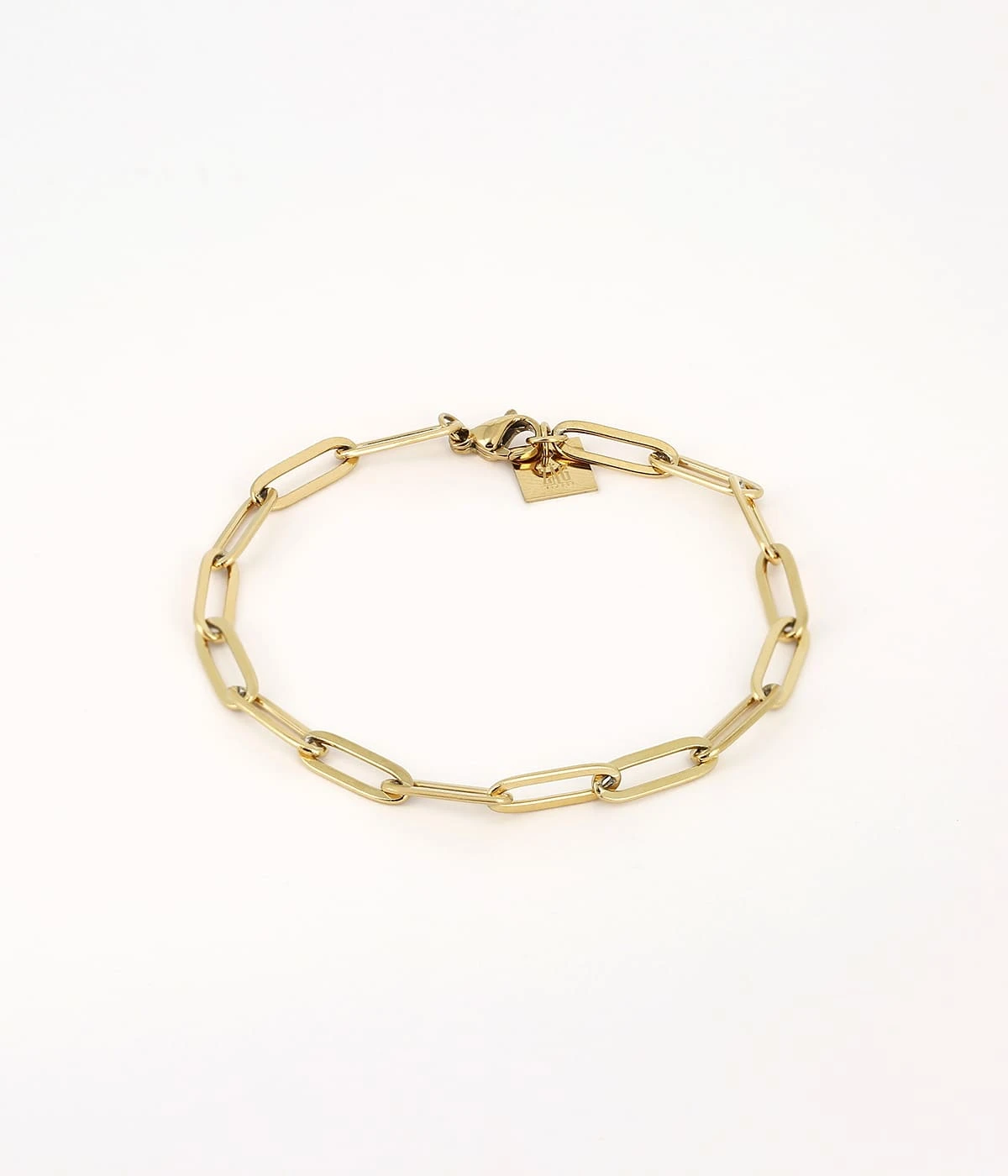 Bracelet composĂ© de maillons ovales en acier dorĂ© Ă lâor fin.