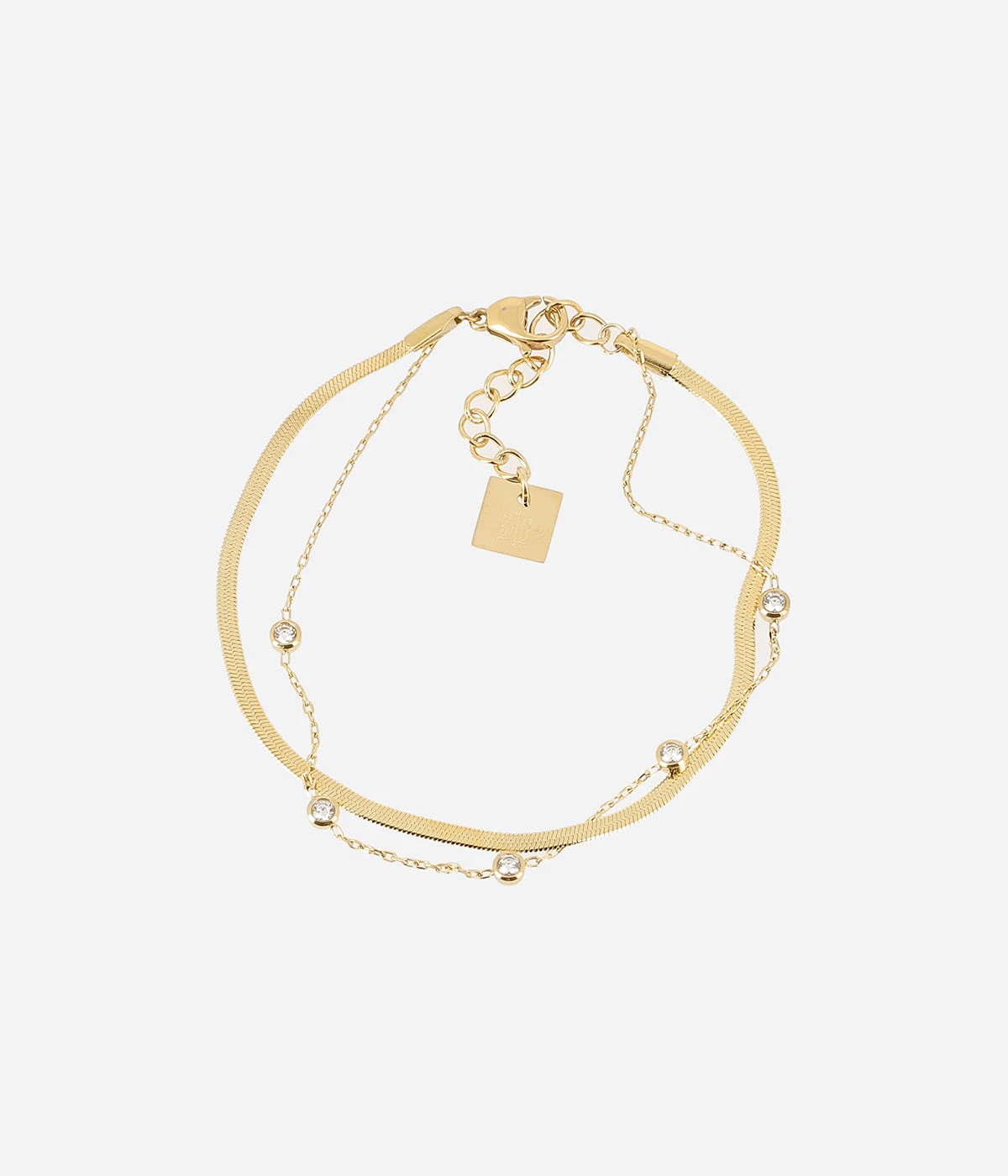 Bracelet double chaĂźne en acier dorĂ© Ă l’or fin. Sur l’une des deux chaĂźnes sont attachĂ©s cinq zirconiums.
