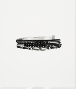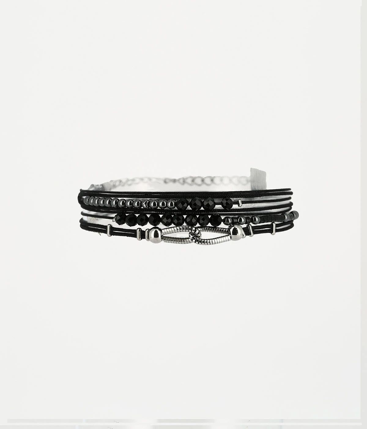 Bracelet multi-tours en acier uni sur lequel des boules d’acier et colorĂ©es sont enfilĂ©es. Deux crochets s’enlacent au centre de ce bijou.