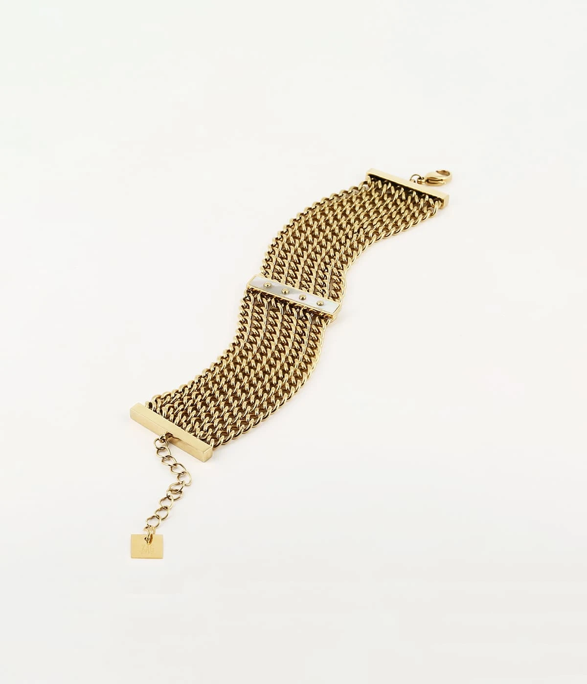 Bracelet en acier dorĂ© Ă l’or fin formĂ© de six chaĂźnes juxtaposĂ©es et sĂ©parĂ©es par une mĂ©daille rectangle composĂ©e de nacre et piquĂ©e de quatre boules d’acier.