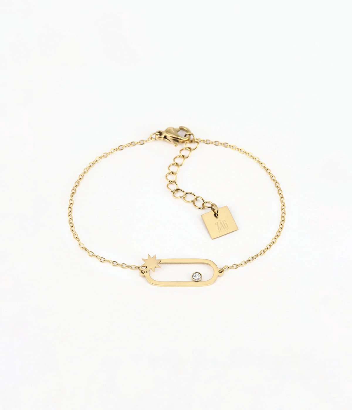 Bracelet en acier uni ou dorĂ© Ă l’or fin. Un ovale de mĂ©tal laquĂ© d’un cristal en serti clos est placĂ© entre les deux chaĂźnes.