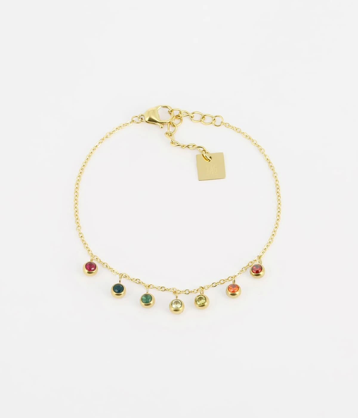 Bracelet en acier dorĂ© Ă l’or fin sur lequel sont suspendues des petites pampilles en forme de boule, qui reprĂ©sentent les 7 couleurs des chakras : rouge pour la racine, orange pour le sacrĂ©, jaune pour le plexus solaire, vert pour le coeur, bleu pour la gorge, bleu foncĂ© pour le troisiĂšme oeil, violet pour la couronne.