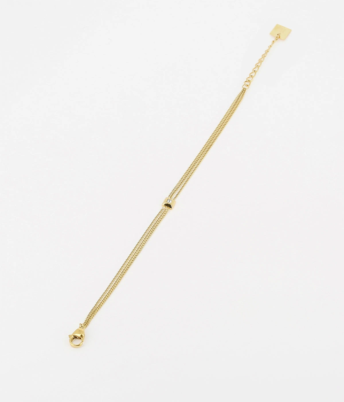 Bracelet en acier uni ou dorĂ© Ă l’or fin Ă triple chaĂźne qui relient en leur centre un carrĂ© serti de zirconiums en son centre.