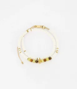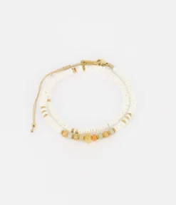 Bracelet cordon ajustable sur lequel sont enfilĂ©es des pierres de couleurs parsemĂ©s de motifs d’acier dorĂ©.