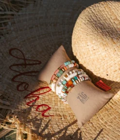 Bracelet multi-rang en coton naturel sur lequel sont enfilĂ©es des pierres naturelles parsemĂ© de petits Ă©lĂ©ments en acier dorĂ© Ă l’or fin.