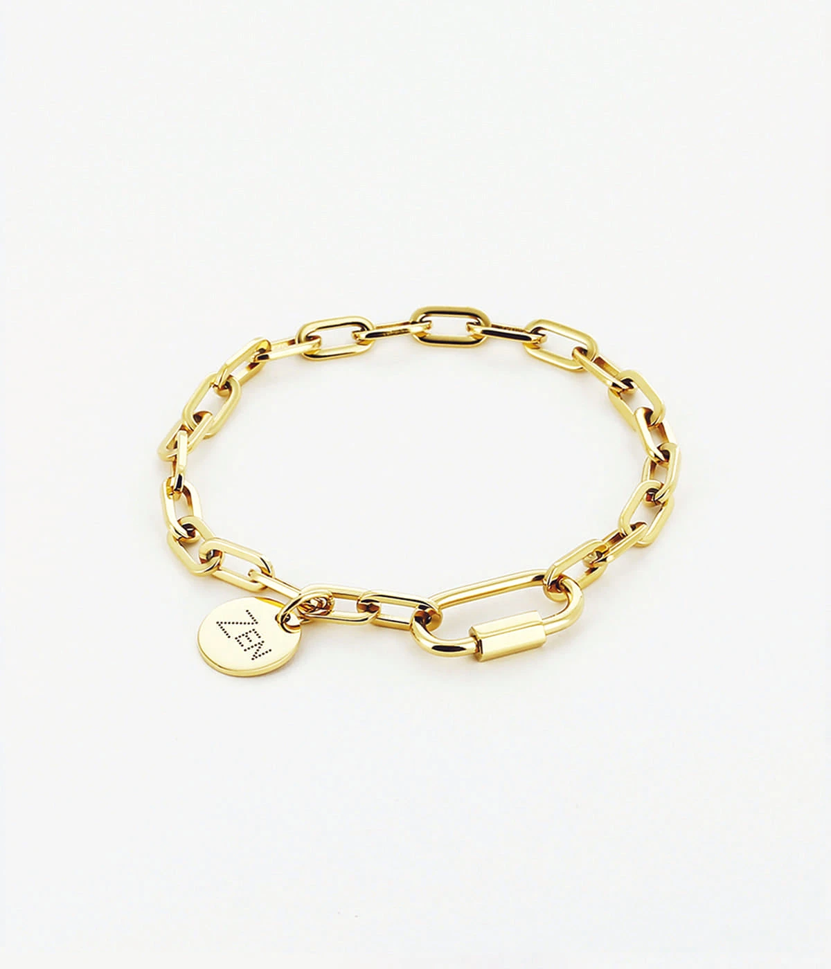 Bracelet chaĂźne Ă gros maillons en acier uni ou dorĂ© Ă lâor fin sur lequel est attachĂ©e une mĂ©daille gravĂ©e du mot « Zen ».