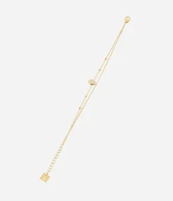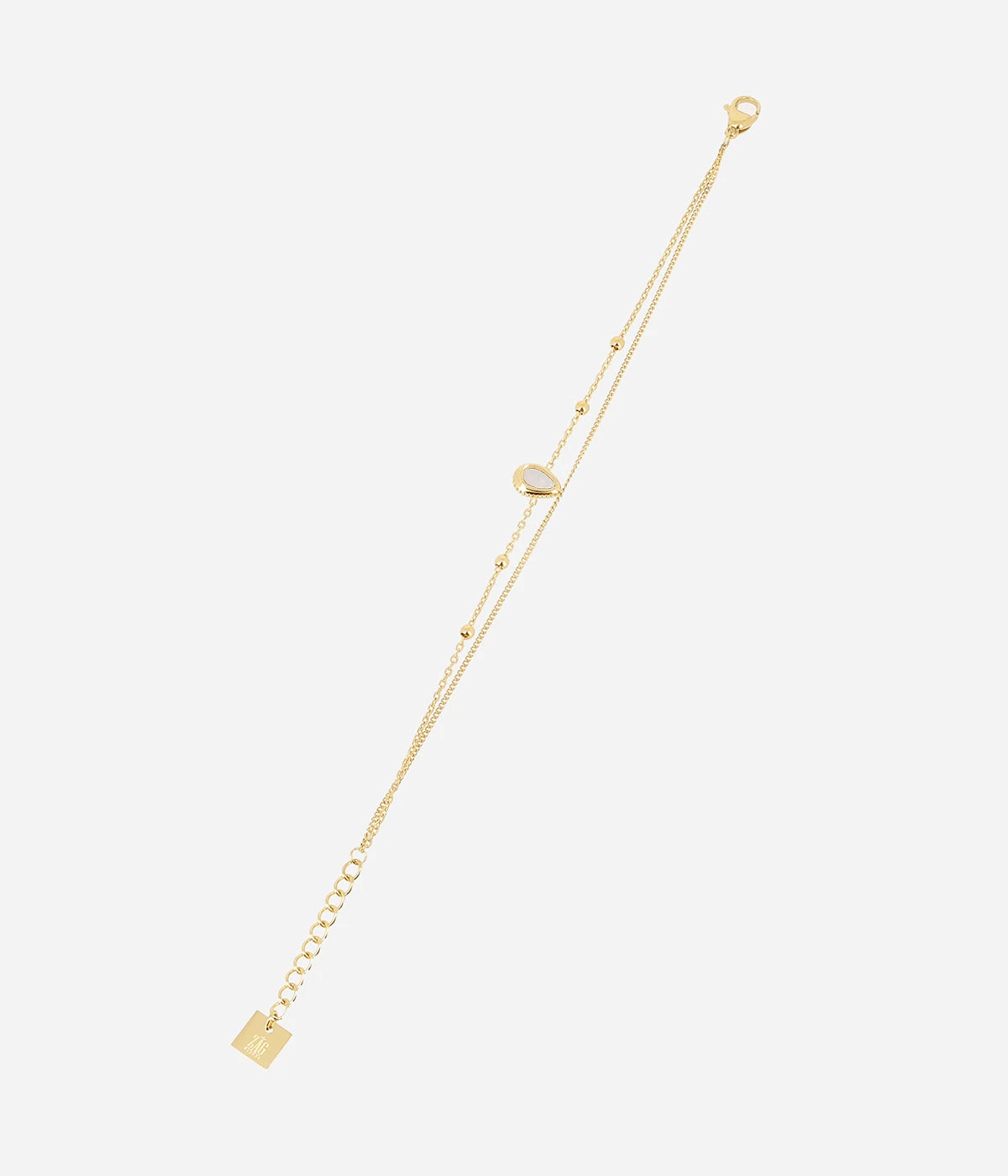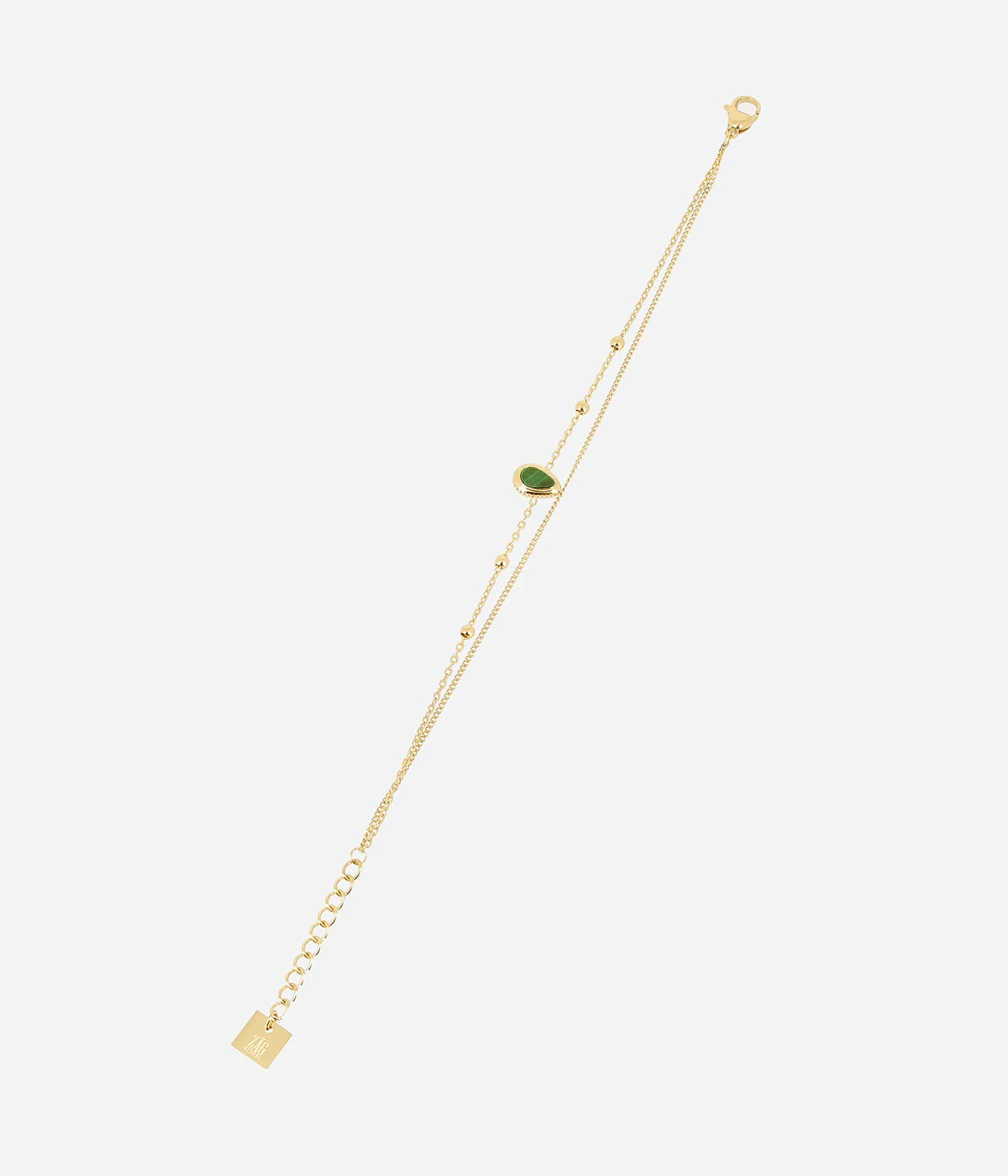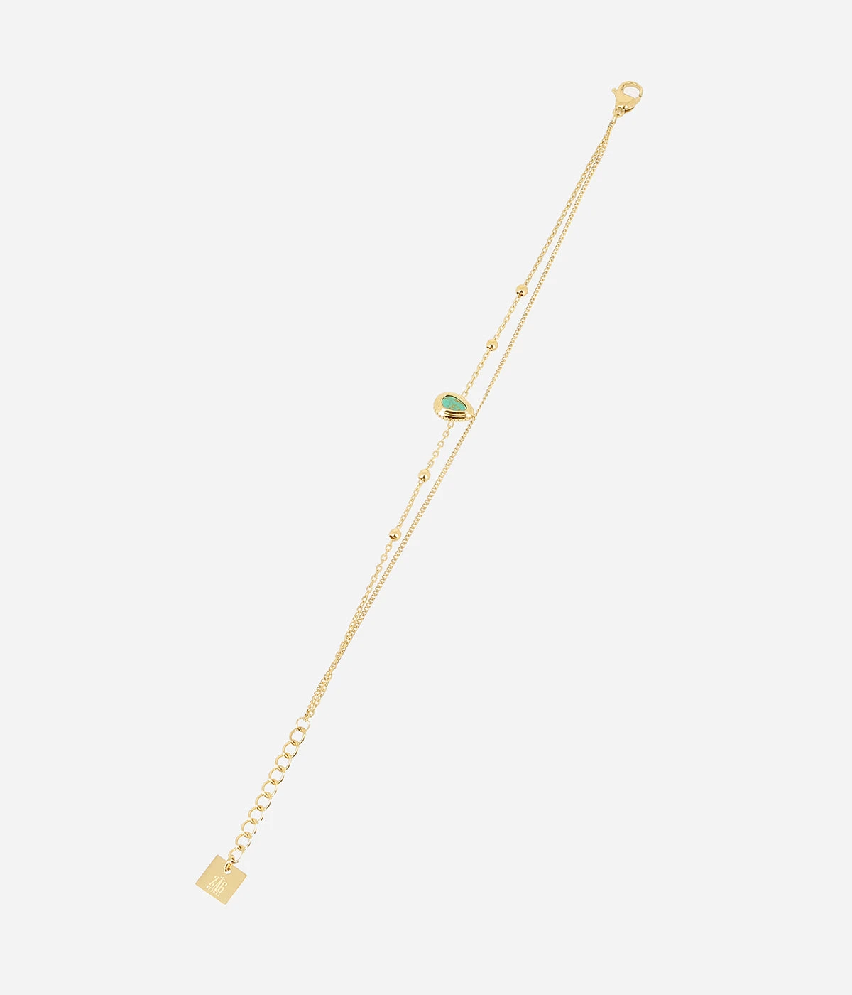 Bracelet double chaĂźne en acier dorĂ© Ă l’or fin. Sur l’une des chaĂźnes est attachĂ© un pendentif colorĂ© et des boules d’acier dorĂ©.