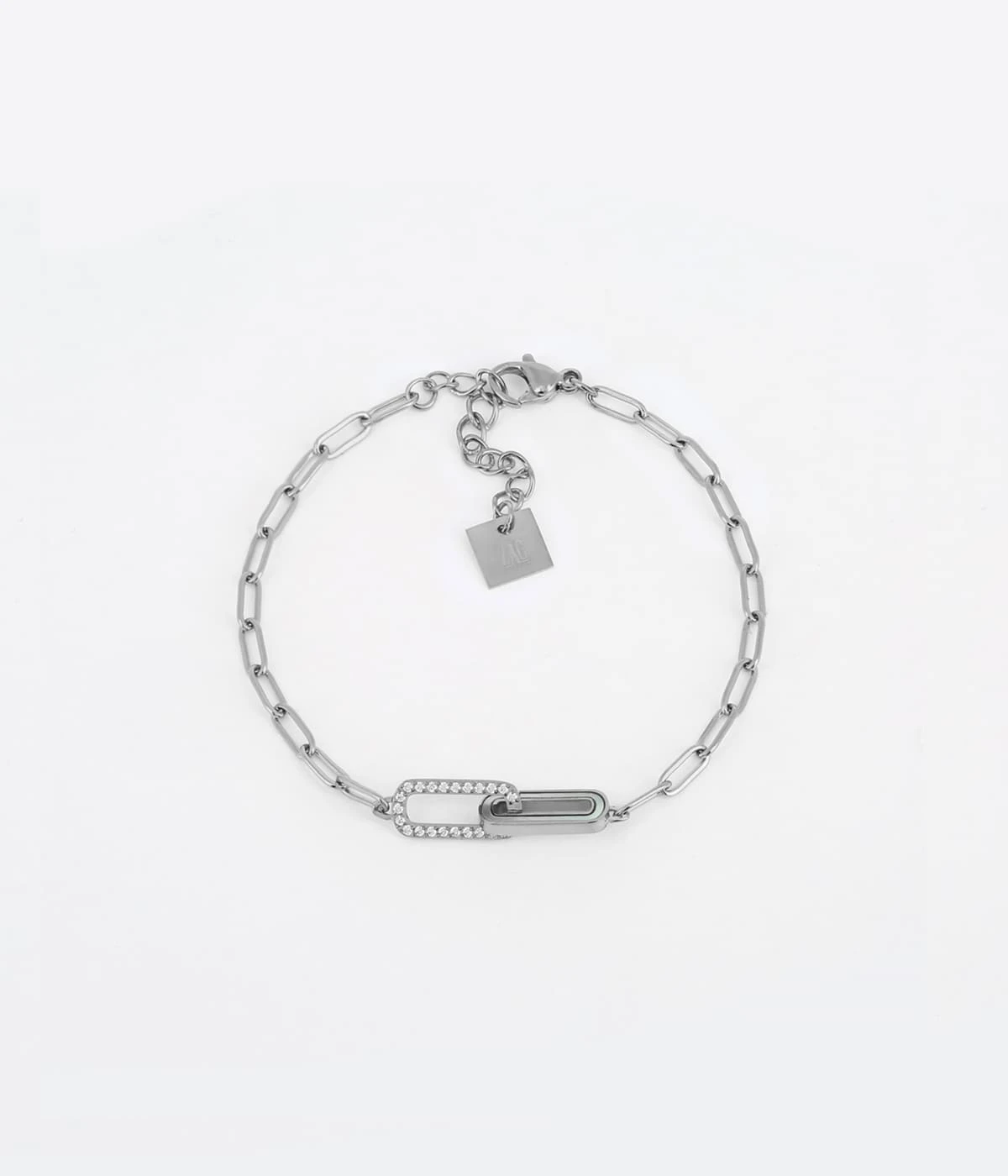 Bracelet maillons en acier uni sur lequel sont attachĂ©s des maillons dont un est colorĂ©, et l’autre serti de zirconiums.